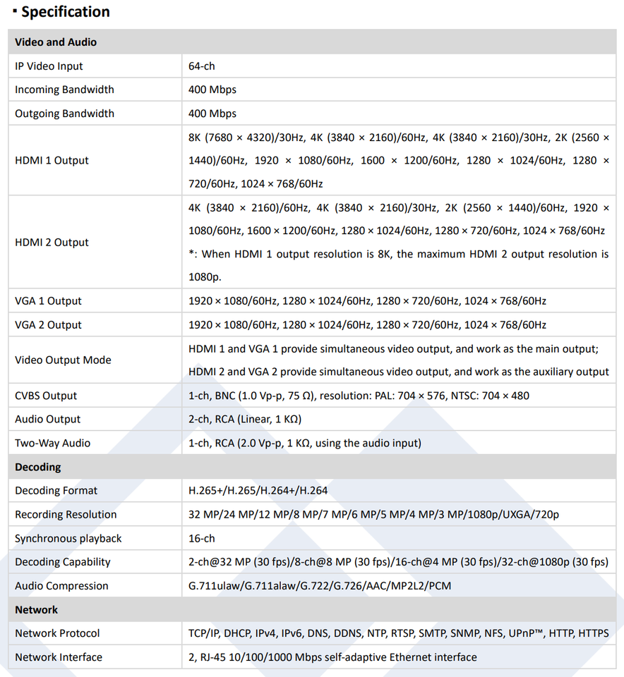 Up to 4ch@12MP / 8ch@8MP / 16ch@4MP / 32ch@1080p decoding capacity