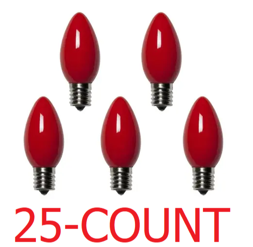- 25-count red C9 incandescent replacement bulbs with ceramic bases