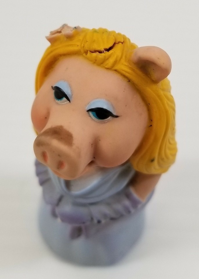 Fozzie figure is in very good, vintage condition whereas Miss Piggy is in rough shape with a torn ear, slight crack at the top of the head and some staining to the top of her nose