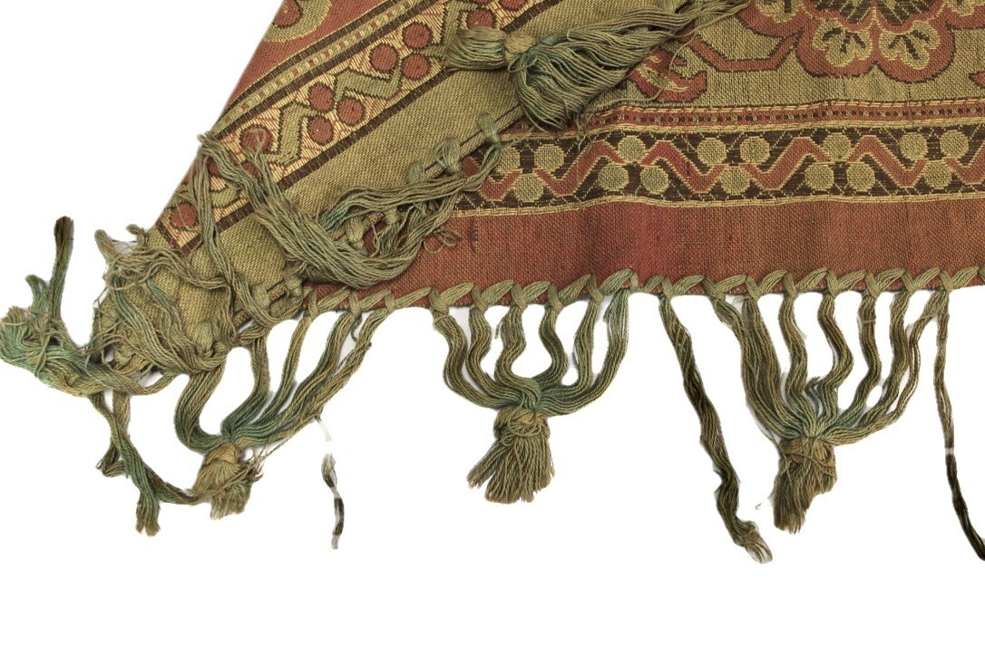 Fantastic attic find, this antique woven Arts Crafts Era table cover is in muted shades of red and green with pale gold in the floral pattern.