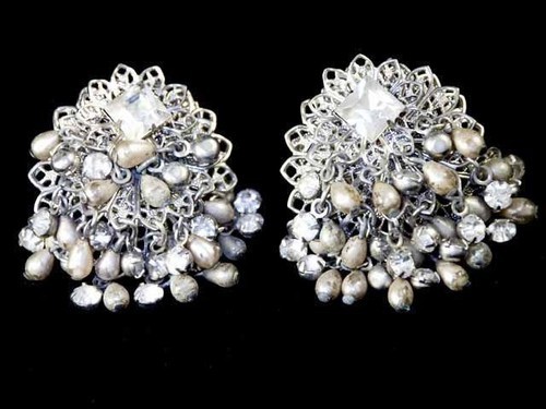 Vintage RETRO Rhinestone Pearls Jiggly Disc Button Clip Earrings 1950S