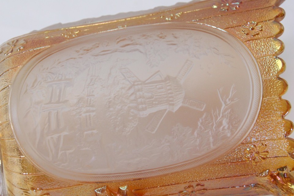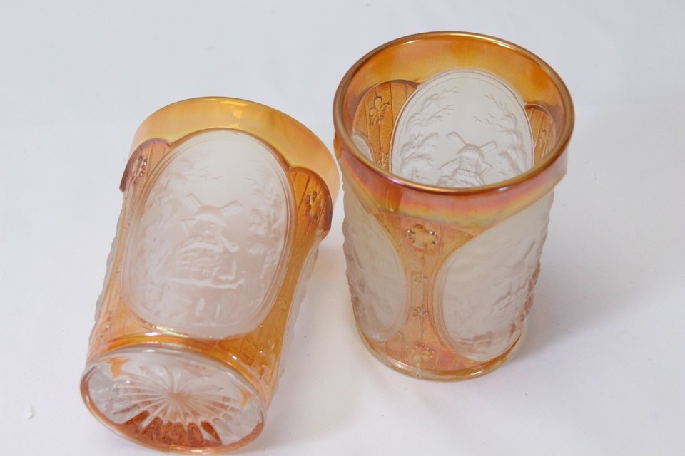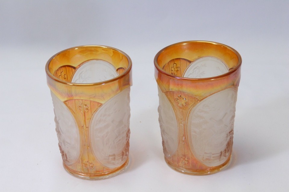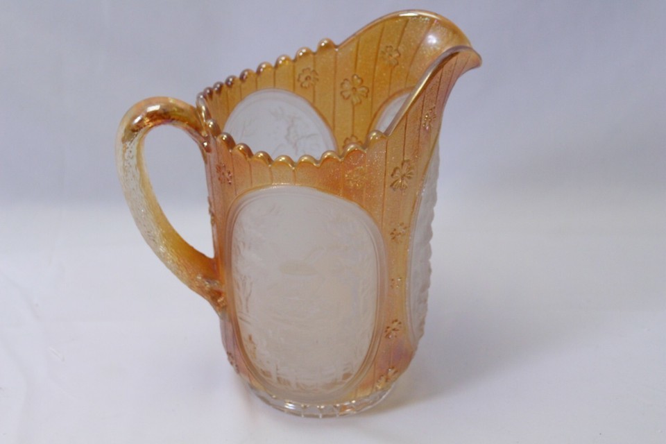 Imperial Glass Windmill and Cabin Pitcher Marigold Carnival on Frosted with 2 Tumblers