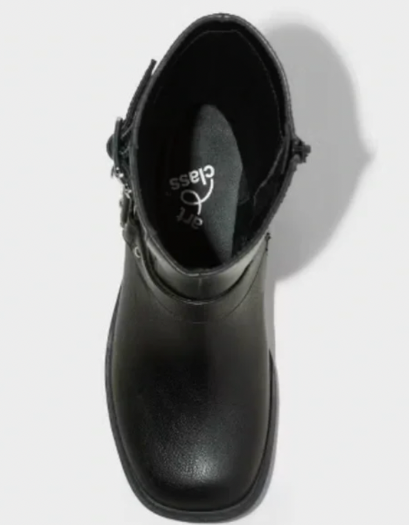 Your child will be ready take on cooler-weather days in style with these Dee Tall Buckle Boots from art class. Made from faux leather, these black boots are elevated by a harness strap accented with a silver-tone ring along with matching buckles and grommets running down the side. Set on a 1.25-inch block heel with a textured TPR outsole, these mid-calf boots are finished with a side zipper fastening for a snug, secure fit.