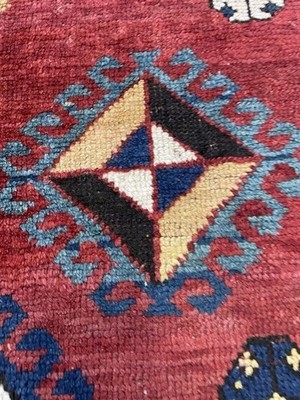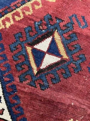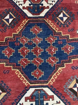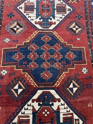 This exceptional antique Caucasian Lori Pambak rug from the 1880s is a commanding masterpiece of nomadic weaving. Woven over a century ago, it embodies the bold artistic spirit of the Caucasus region. Furthermore, its striking geometric composition and vibrant, contrasting colors are hallmarks of this celebrated style. Consequently, this rug is not merely a furnishing but a powerful and authentic declaration of tribal art. A Bold Geometric Composition The rug's design is anchored by a large, commanding central medallion set against a rich, deep red field. This primary form is powerfully flanked by two additional geometric medallions, creating a dynamic and balanced layout. Moreover, the entire field is populated with an array of smaller geometric symbols and ancient motifs. Each element is rendered with a clarity and confidence unique to Lori Pambak weavings. Vibrant Colors and Characteristic Border The color palette is both vibrant and harmonious, creating a stunning visual impact. The deep navy blue and crisp ivory motifs offer a dramatic contrast against the warm red background. Accents of a golden yellow hue add warmth and brilliance to the design. The main border features a classic and repeating "crab" or cross pattern. This distinctive motif is a definitive characteristic of rugs from this specific region. A Statement of History and Art For its considerable age, the rug remains in good, stable condition. It possesses a beautiful, overall patina and minor signs of wear that attest to its history and authenticity. The wool has retained its strength and vibrant character. Its impressive size and bold, timeless design make it a perfect statement piece for a living room, a grand study, or as a magnificent floor covering in an entryway. Product Details Age: Circa 1880s Origin: Lori Pambak, Caucasus Material: 100% Wool Condition: Good (With a beautiful patina and minor signs of age) Dimensions: In Feet: 4' 11" x 7' 6" In Centimeters: 150 cm x 229 cm In Inches: 59" x 90"