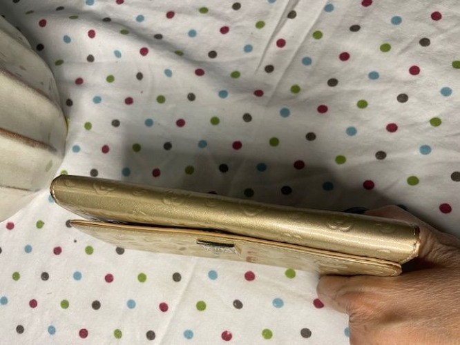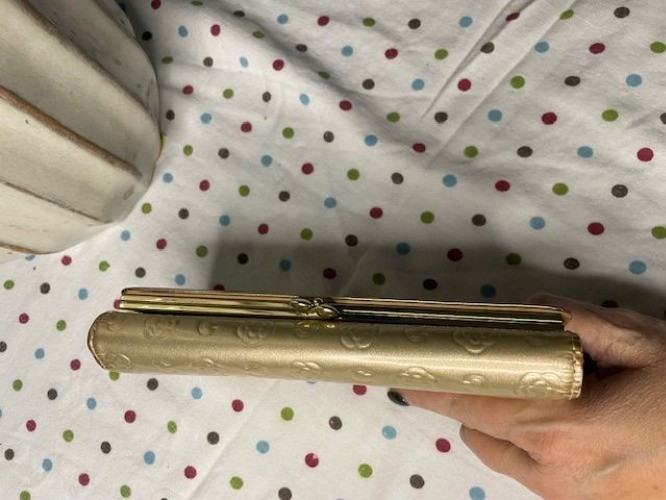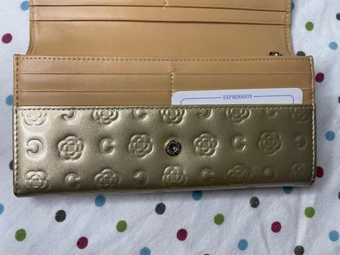 Elegant and functional long wallet by Clathas, featuring a metallic gold finish embossed with the brand?s signature camellia and ?C? motif throughout. The front is accented with a crystal-studded logo plate for a touch of sparkle. Interior includes multiple card slots, bill compartments, and a zippered coin pocket, lined with floral patterned fabric. Secures with a snap closure and metal kiss-lock clasp for added style. Preloved condition with light wear on corners/edges, but interior remains clean and functional.
