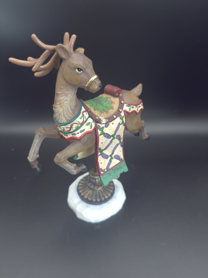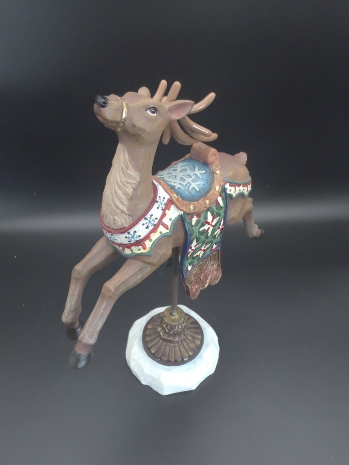 brimming with gifts and three carousel-style reindeer, each mounted on