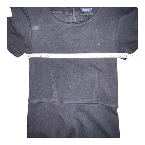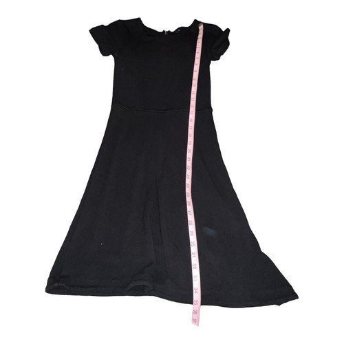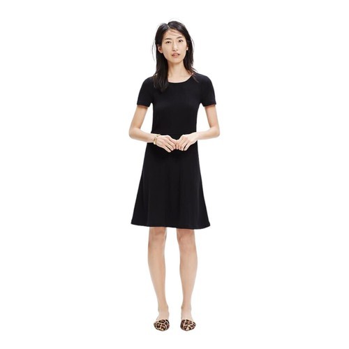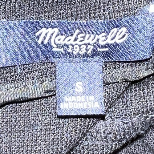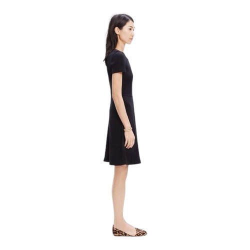 This black Madewell dress is perfect for any occasion, from parties to workwear. The classic short sleeves and collarless design give it a modest yet fashionable look. The dress is made of a polyester and viscose blend knit fabric, making it comfortable and machine washable.