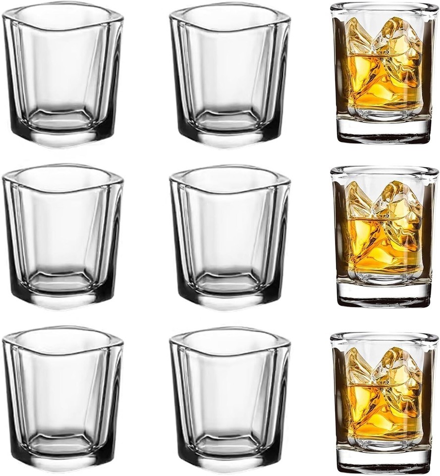 ?HEAVY SOLID GLASS BASE? Classic square shot glass shape with heavy solid glass base, perfectly balanced to prevent tipping and spilling.