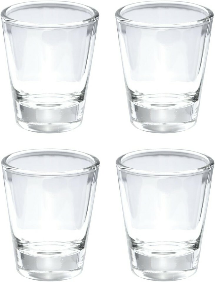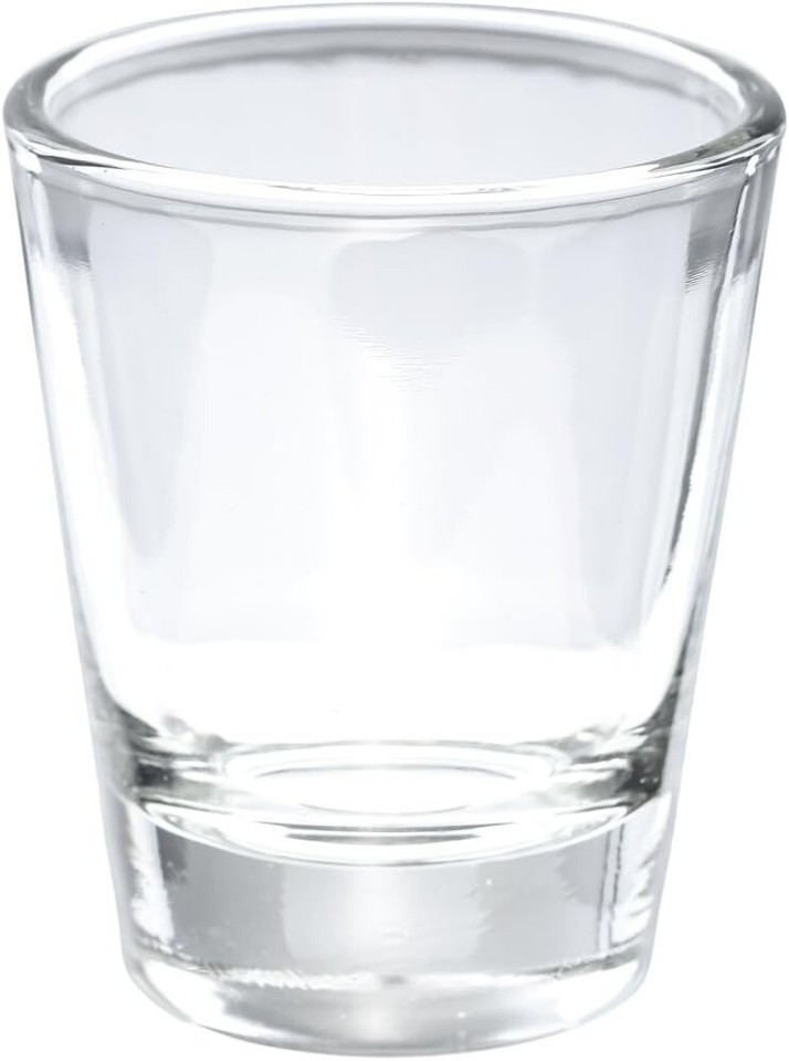 Round 1.5 oz shot glass, sturdy clear glass construction, classic shot glass shape