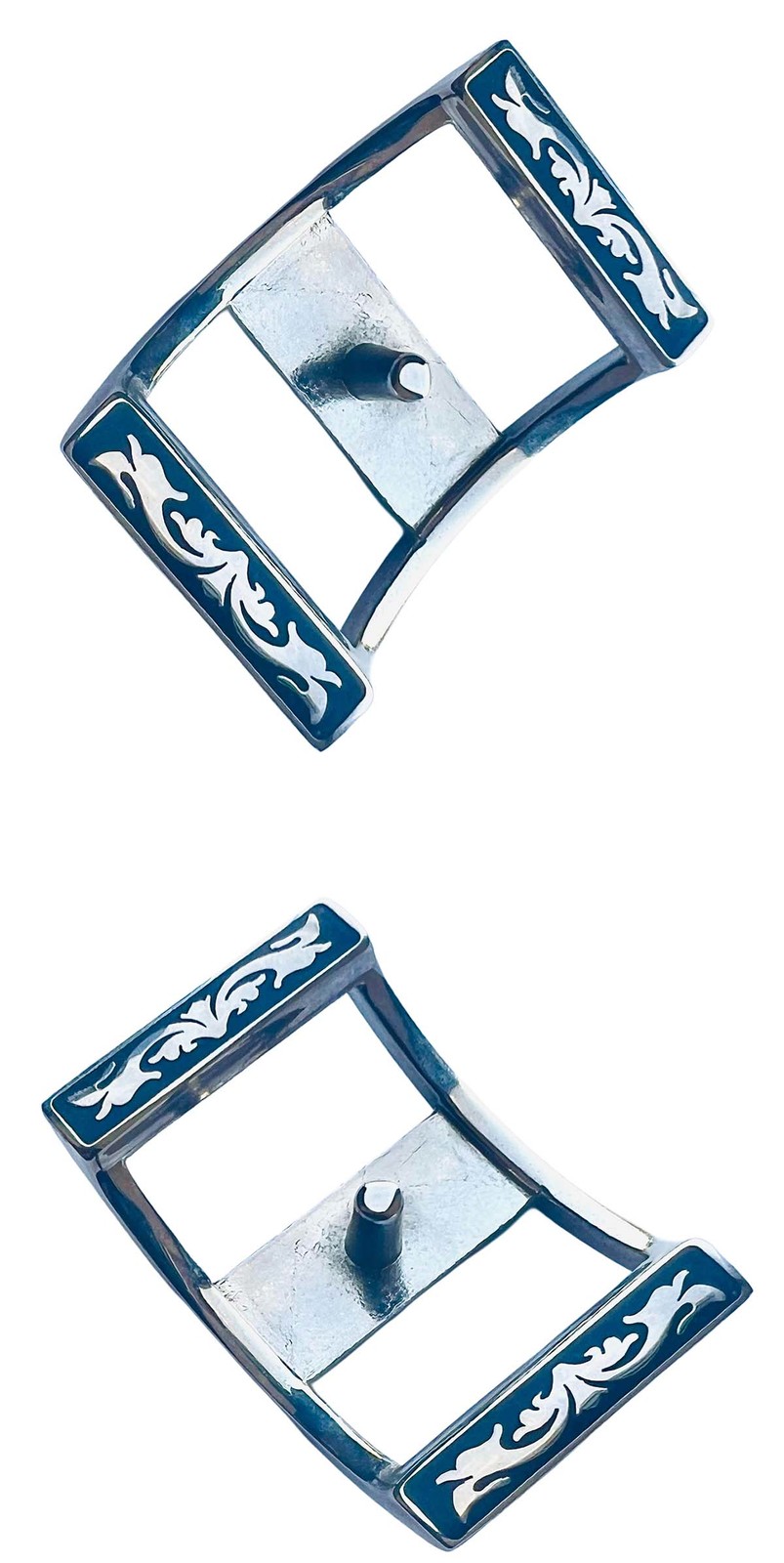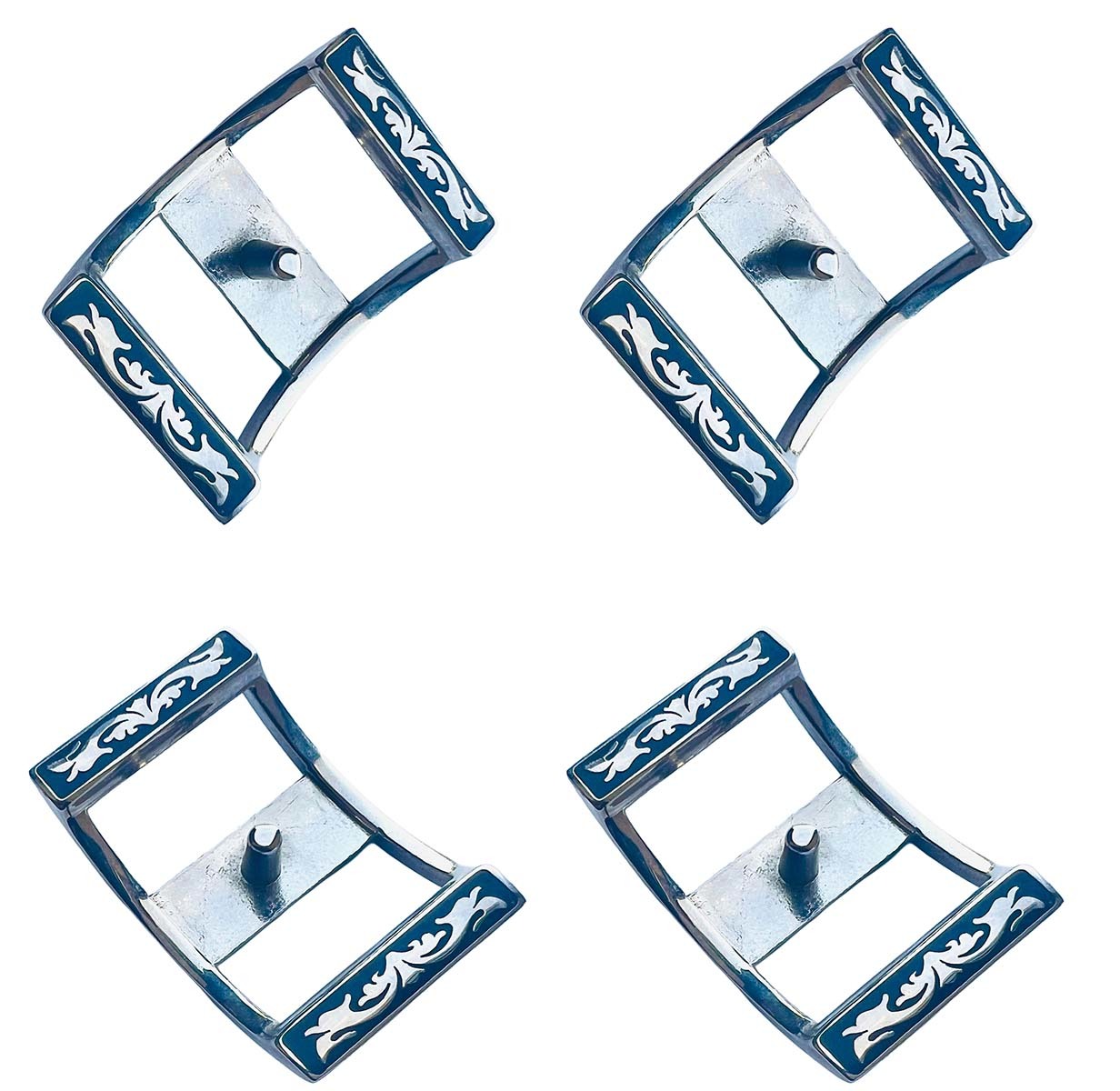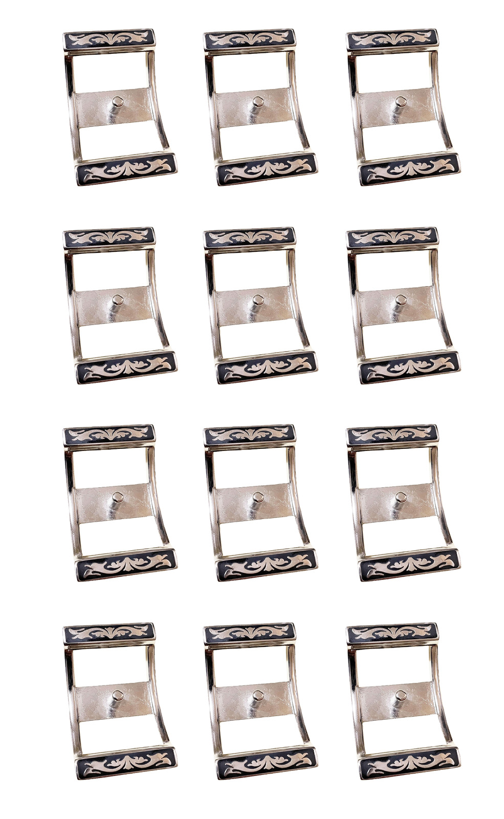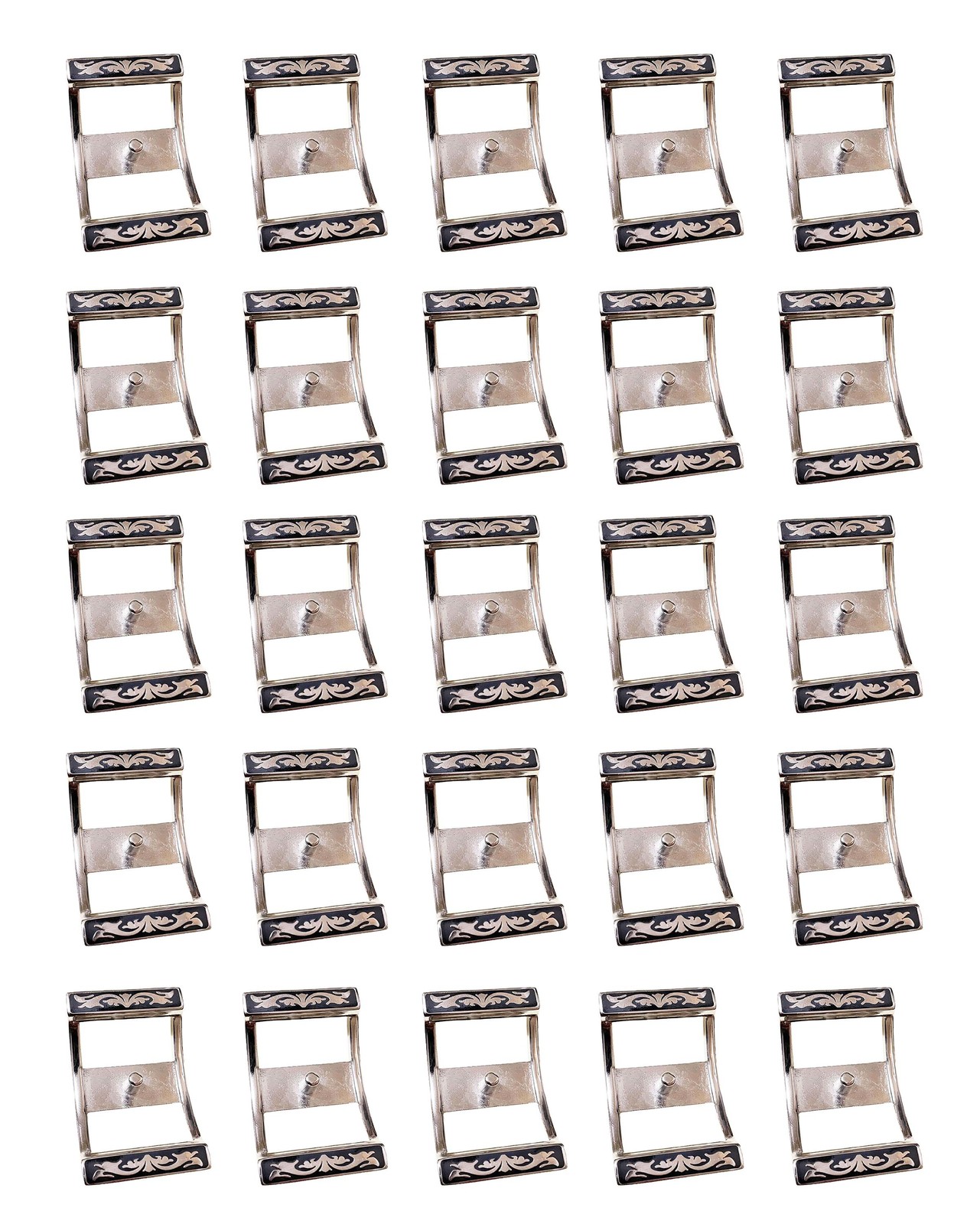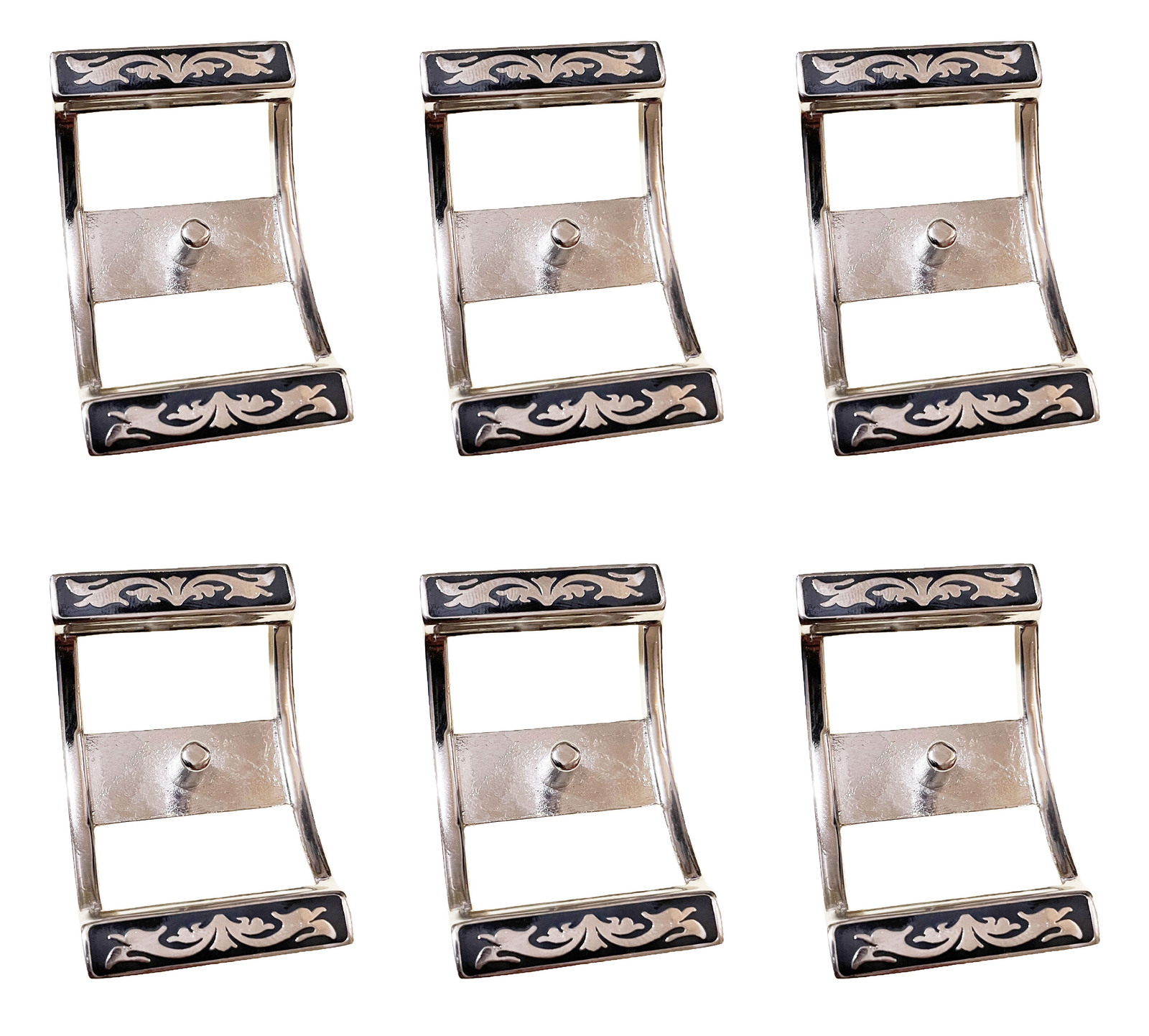 Lot of (6) 7/8" nickel plated floral accented conway buckles. Adds a unique flare to your favorite leather tack. Center post buckle lets you adjust from both ends.