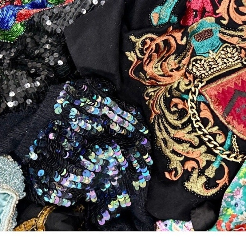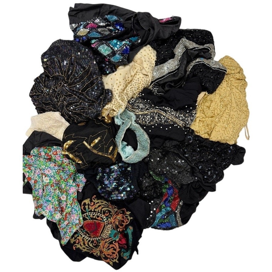 Unleash your inner designer with this incredible 14 piece lot of damaged beaded, sequined, embroidered garments! We simply couldn't bear to throw these treasures away when they hold so much creative potential. While these items have flaws?some are just missing enough beads to make garment repair impossible, or have other damage?they are an absolute goldmine for upcycling projects or creating dazzling costumes for film, TV, Broadway, or even a school play.