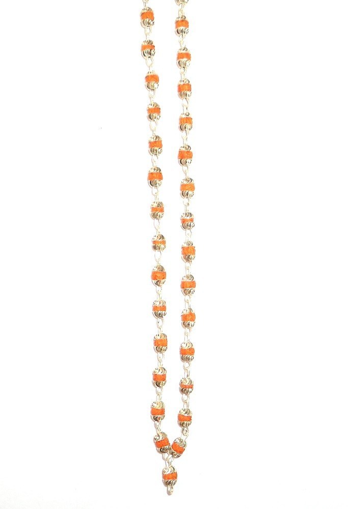 Design : This Rudrani Mala contains 108 Beads and the Beads are strung in a silver wire with silver self design caps and Strung in silver wire .