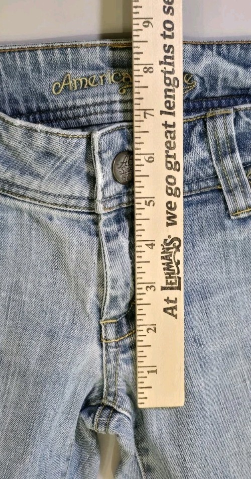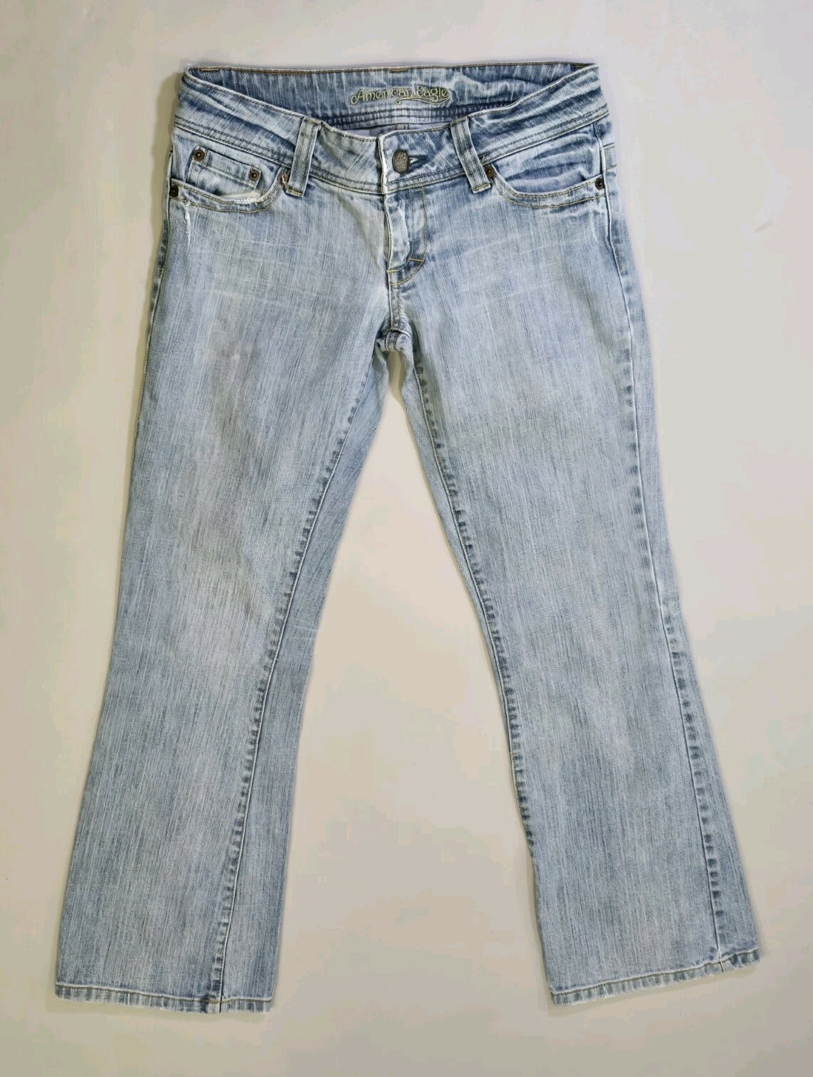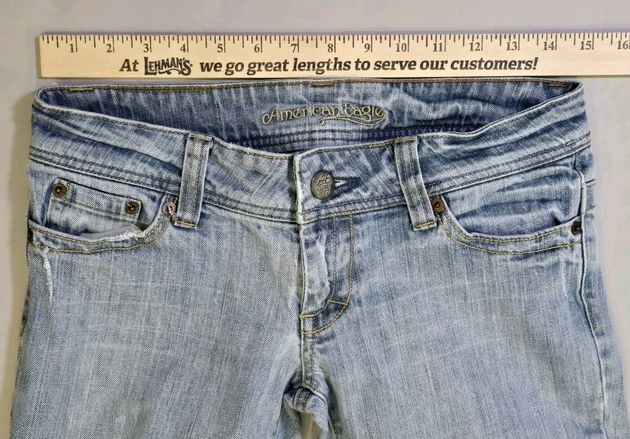 Please note inside care tags have been removed. The product is a pair of vintage Y2K 90s American Eagle Jeans in light blue. They feature a low rise and flare style, with a size 6 waist and 28.5 inch inseam. The jeans are made from a cotton blend denim fabric and have a 5-pocket design. They are machine washable and have a solid pattern with button accents, representing the 90s theme and American Eagle Outfitters brand. This pair of jeans is a stylish and retro addition to any woman's wardrobe.