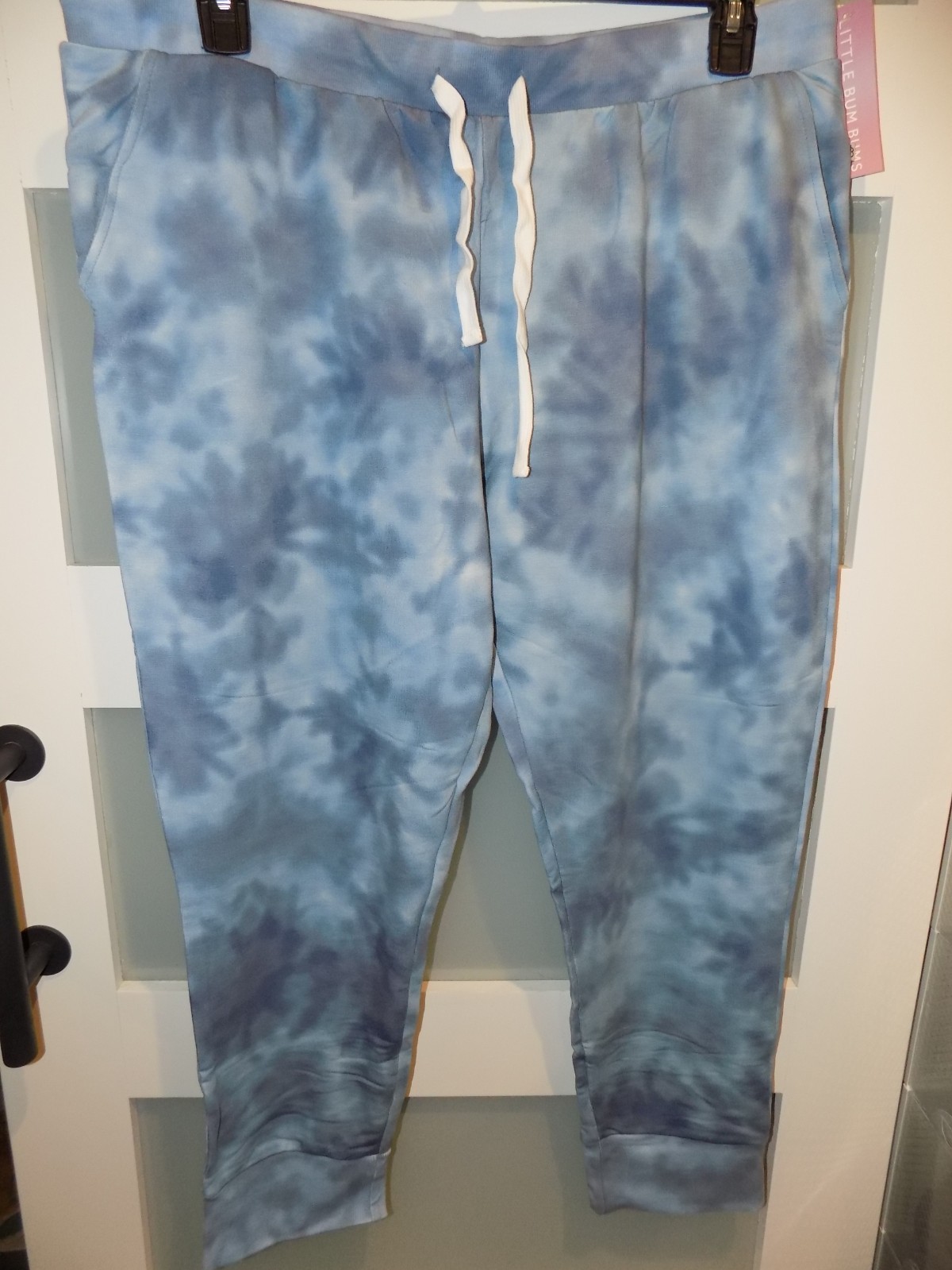The product is a pair of women's jogger sweatpants in size 2XL, featuring a tie-dye design in shades of blue. Made from a blend of viscose from bamboo, cotton, and spandex, these pants are comfortable and stylish. They also include pockets for added convenience. The brand is Little Bum Bums and they are designed for women who appreciate both fashion and comfort in their clothing choices.