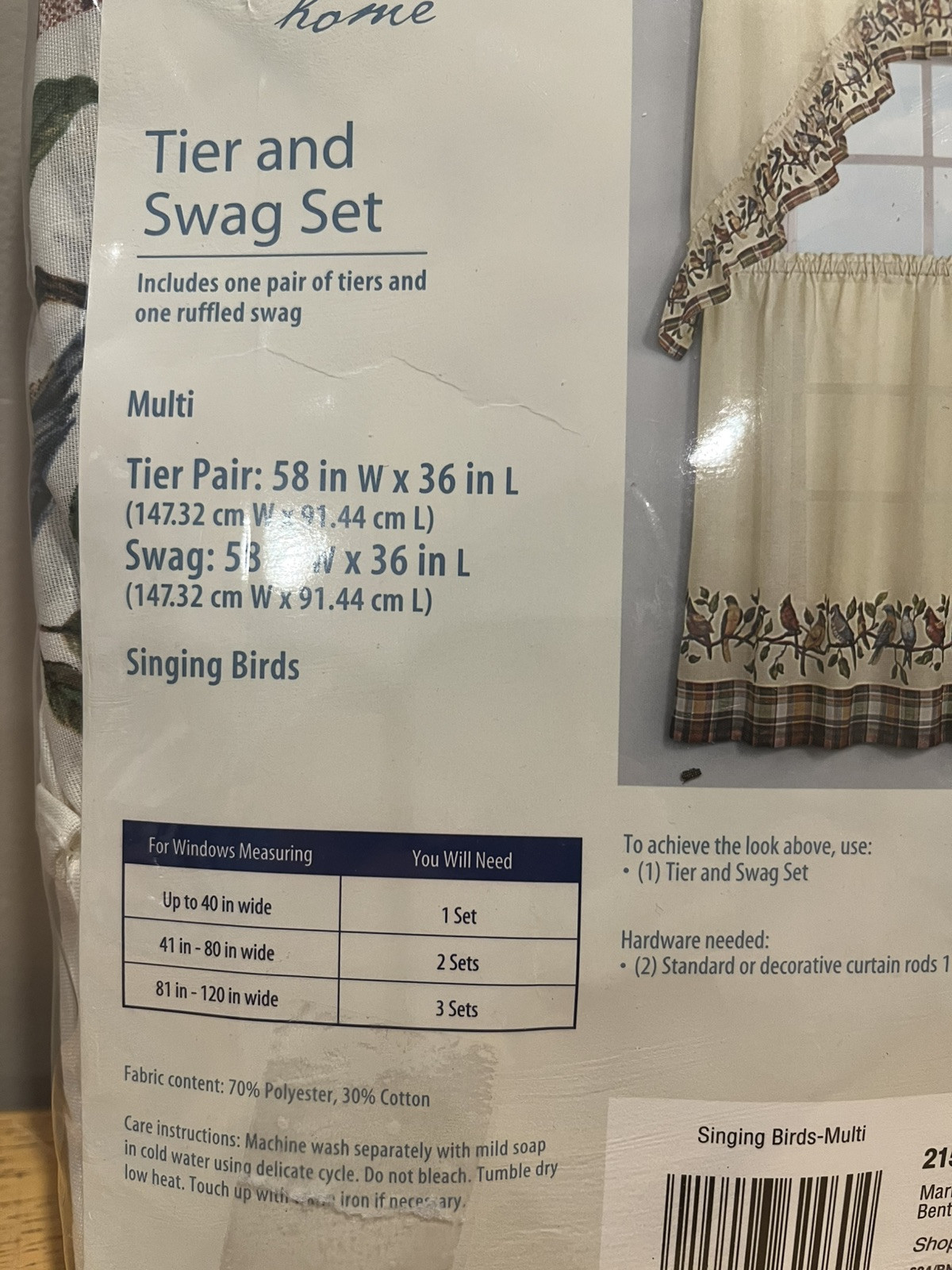 The VINTAGE Mainstays Home Singing Birds Plaid Tier Swag Set features a charming country-style design with a pattern of birds and plaid in a multicolor scheme. Made from a cotton blend material, this set includes a tier curtain measuring 58x36 inches and a matching swag curtain also measuring 58x36 inches. Suitable for any room in the home, this set brings a touch of vintage appeal to your decor. Perfect for collectors or those seeking unique and nostalgic linens for their space.