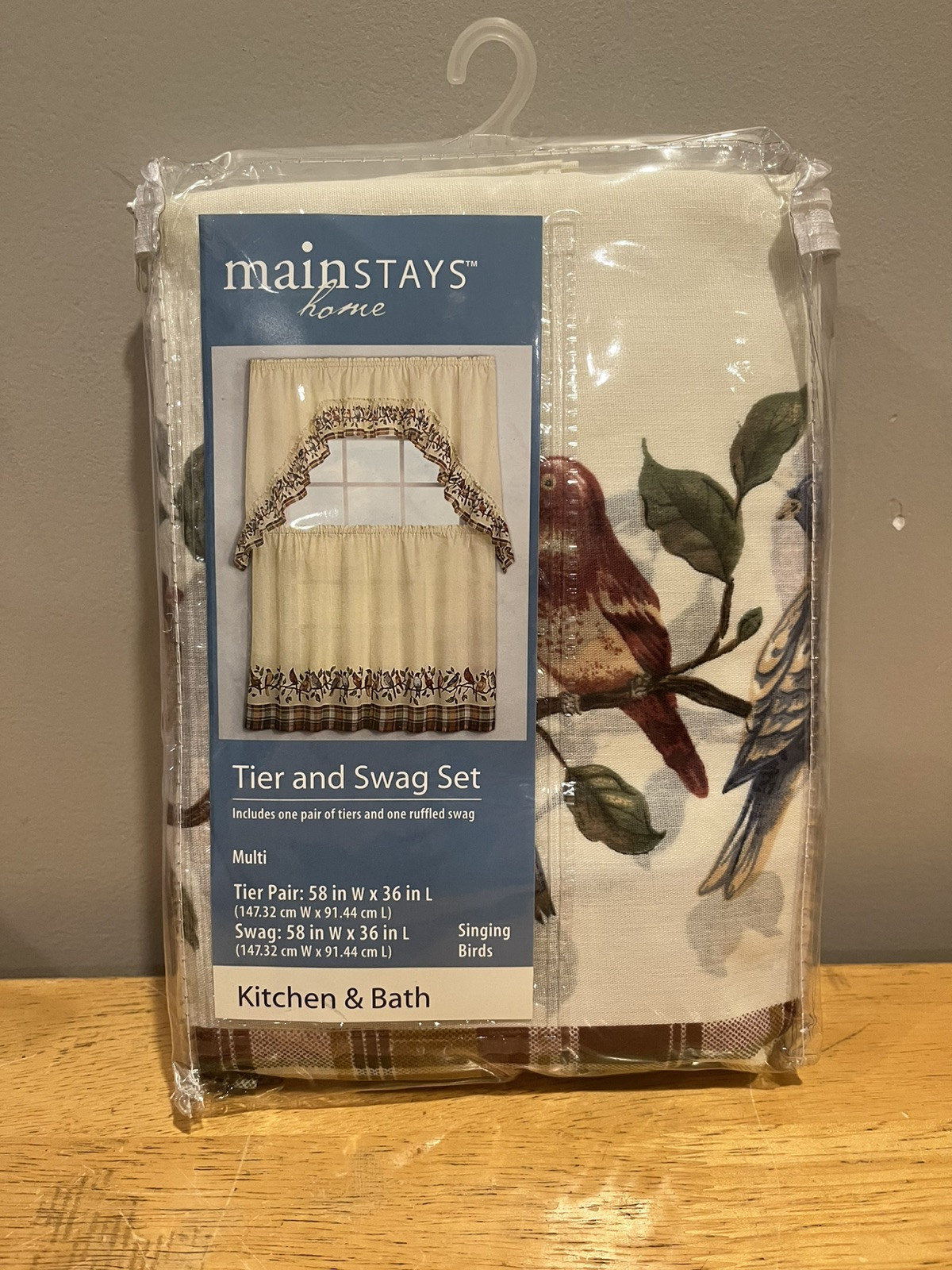 VINTAGE Mainstays Home Singing Birds Plaid Tier (58x36) & Swag (58x36) Set- NEW