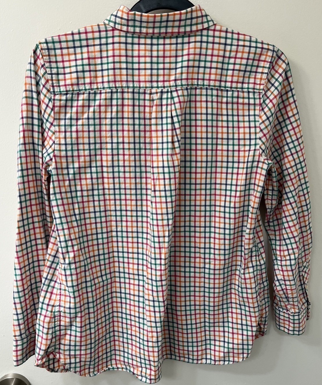 This Talbots shirt is a women's button-up in a petite size M, featuring a multicolor plaid design made from 100% cotton. The shirt has a collared neckline and a button front closure. The shirt is lightweight, breathable, and suitable for all seasons, making it a versatile addition to any wardrobe. Perfect for those looking for a colorful theme with a fun style. Very good condition and comes from a smoke free home! Please let me know if you have any questions!