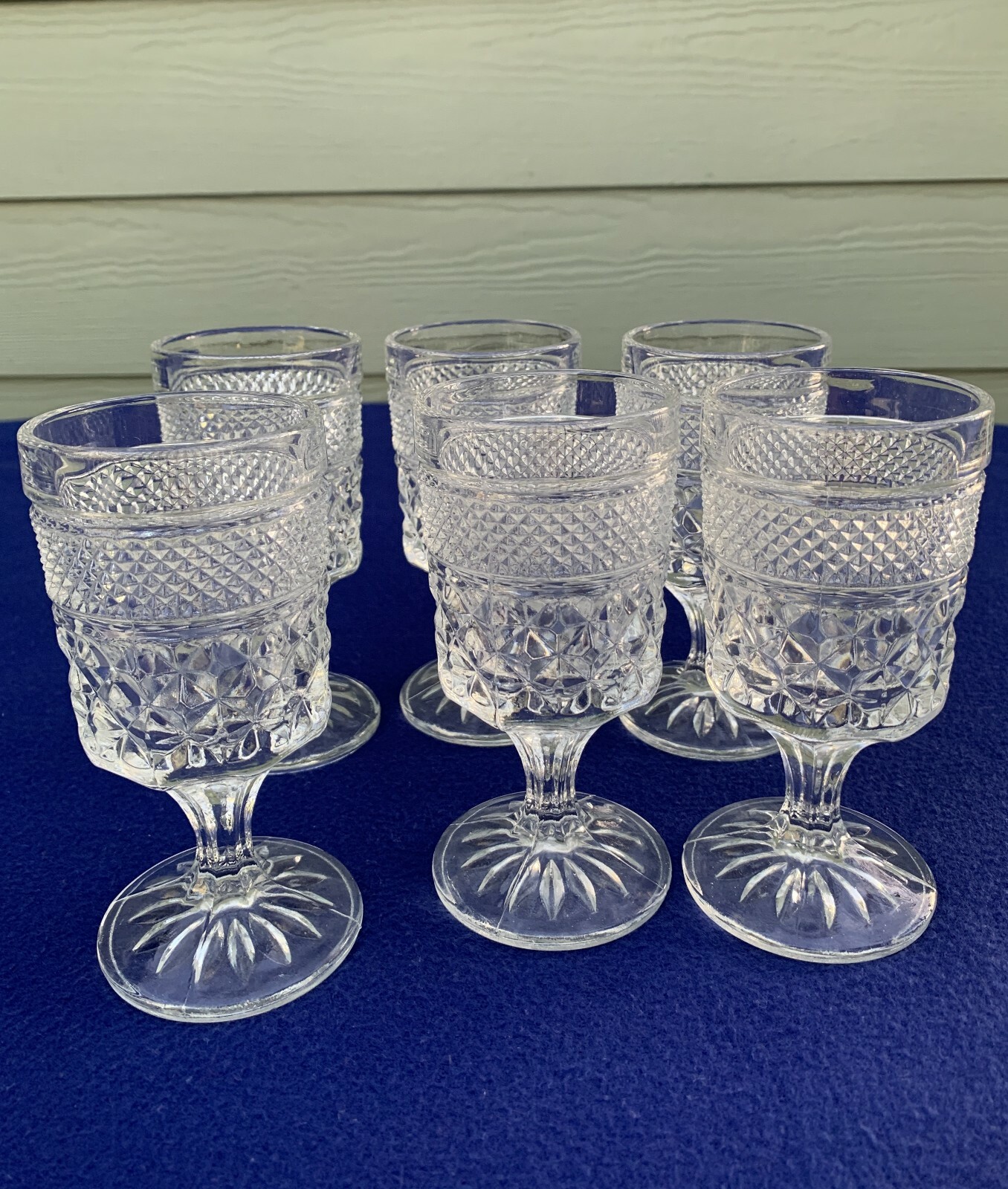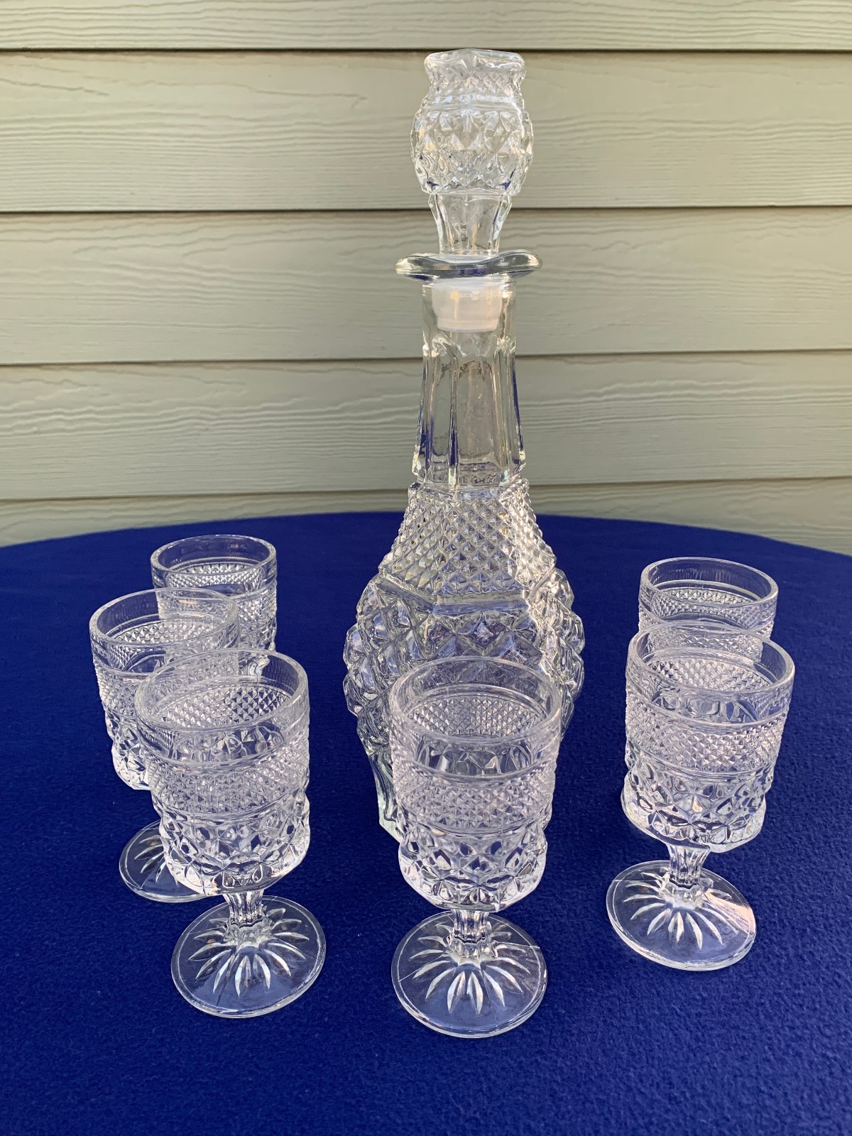 Anchor Hocking vintage set Wexford tall 6 sided clear decanter with stopper 14 1/2"tall assembled, six 4 1/2" wine glasses. All including stopper are very good, no cracks, chips, sickness.