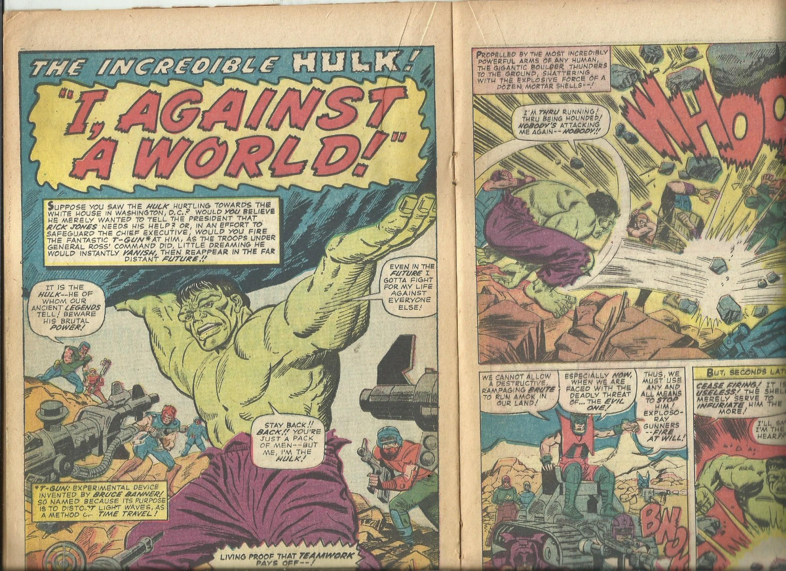*Cover by Gene Colan and Vince Colletta./ Uneasy Hangs the Head..!, script by Stan Lee, art by Gene Colan (as Adam Austin) and Vince Colletta; Namor defeats Krang, reclaims the throne of Atlantis and has Krang exiled. I, Against a World!, script by Stan Lee, art by Jack Kirby, Gil Kane (as Scott Edward) and Mike Esposito (as Mickey Demeo): The Hulk has been zapped into the future by the t-gun and fights with King Arrkam's forces before he is finally overcome; Once he regains consciousness, Arrkam asks his help in fighting "The Evil One" who turns out to be none other than the Executioner.