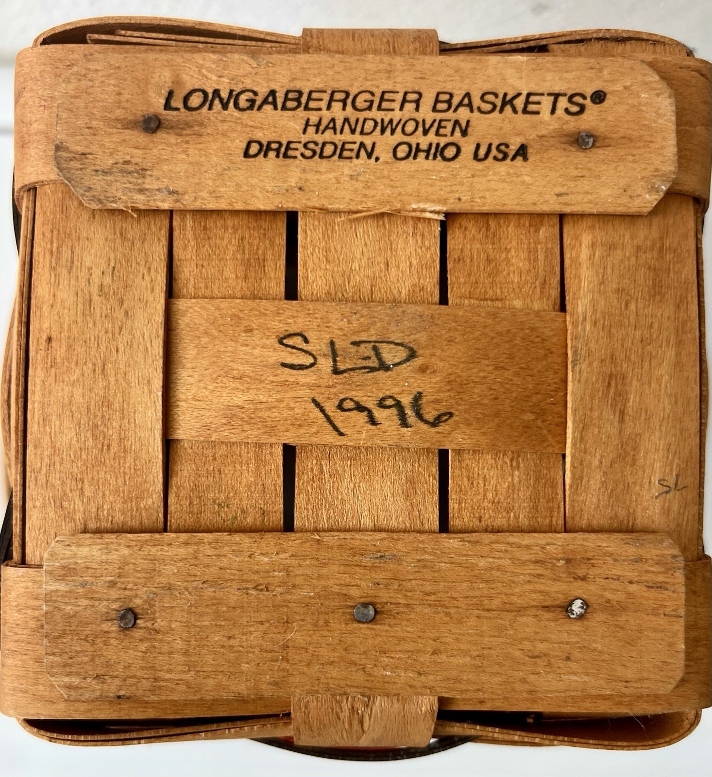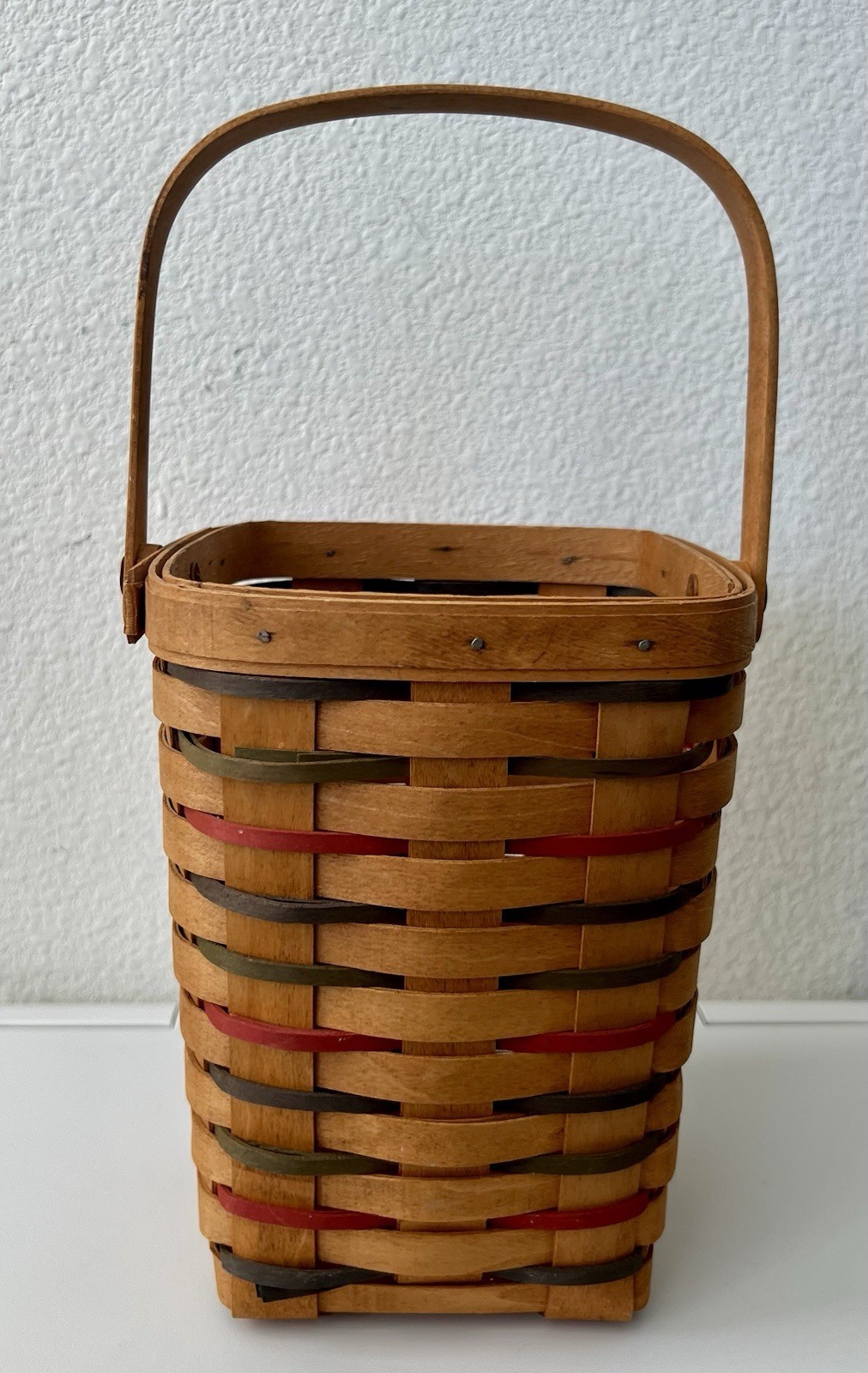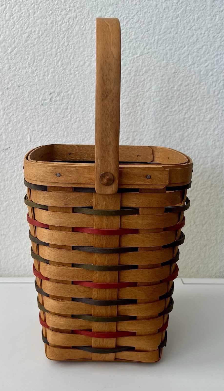The Longaberger Tall Basket with Handle is a handwoven USA baskets from 1996, featuring red and green details. This rectangular-shaped basket is small in size, making it suitable for kitchen storage. It is part of the Arts Crafts Movement style, with a natural finish and all-over pattern. Made of wood, this unique basket is signed by the Longaberger brand and is a perfect addition to any collection.