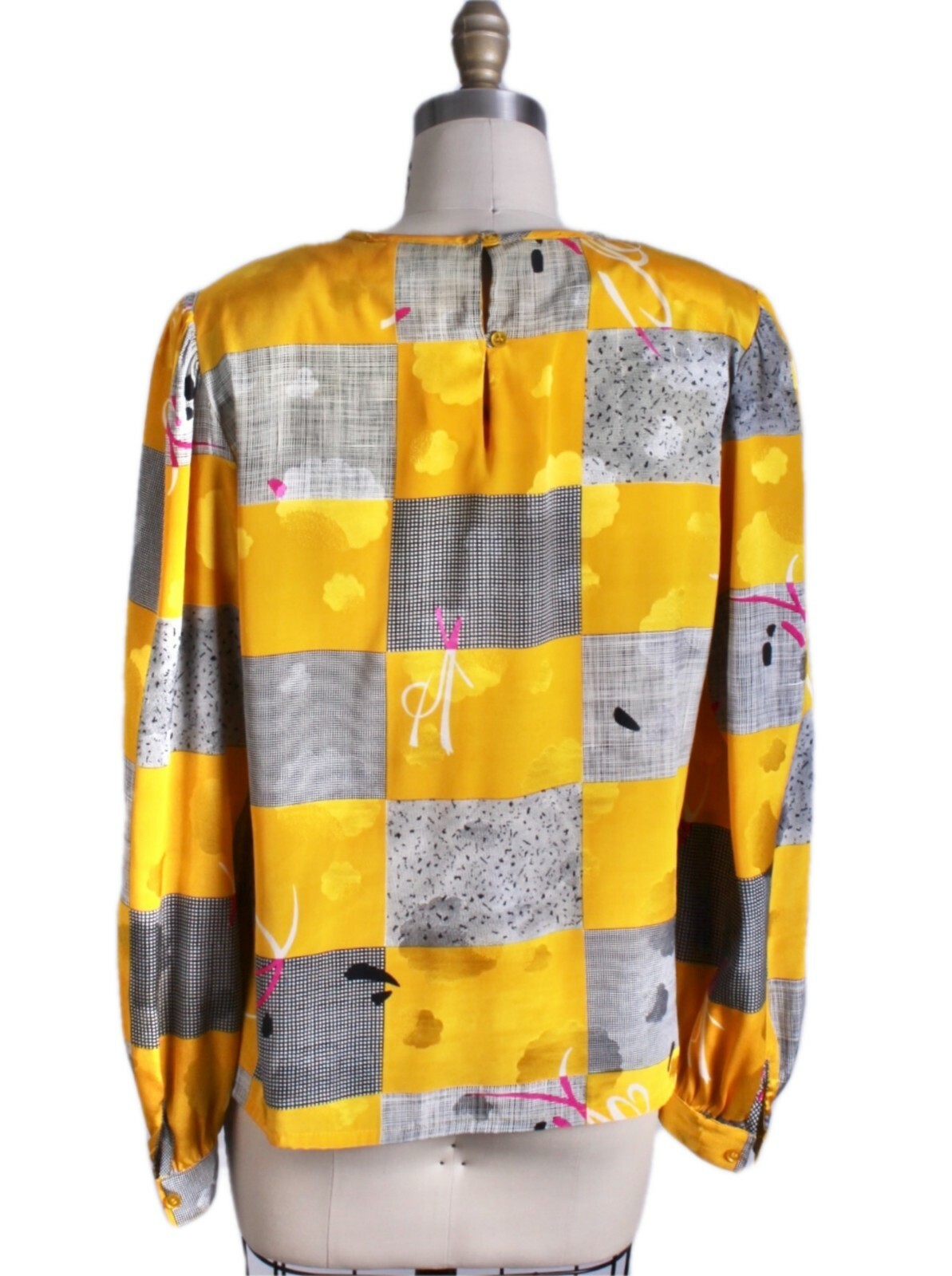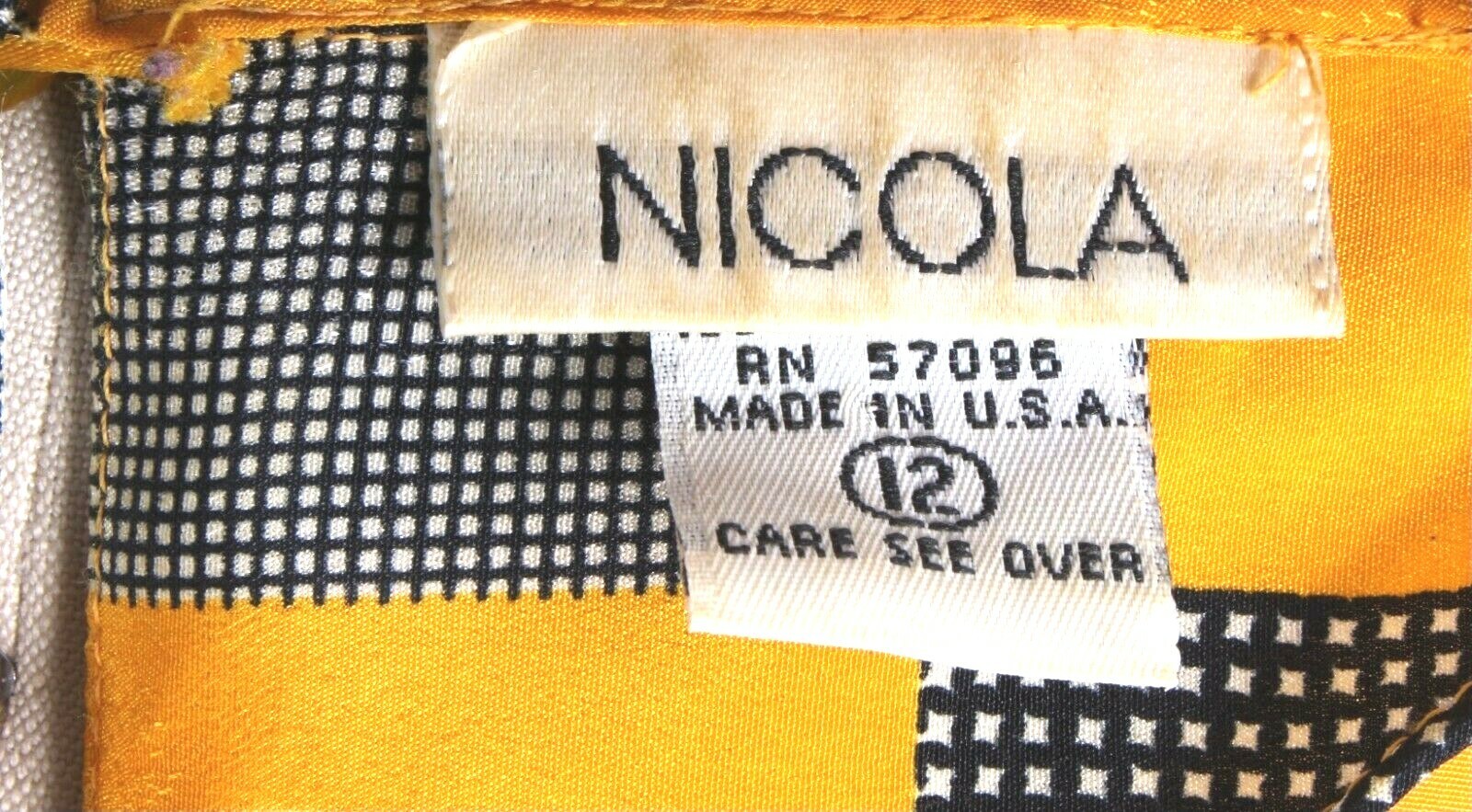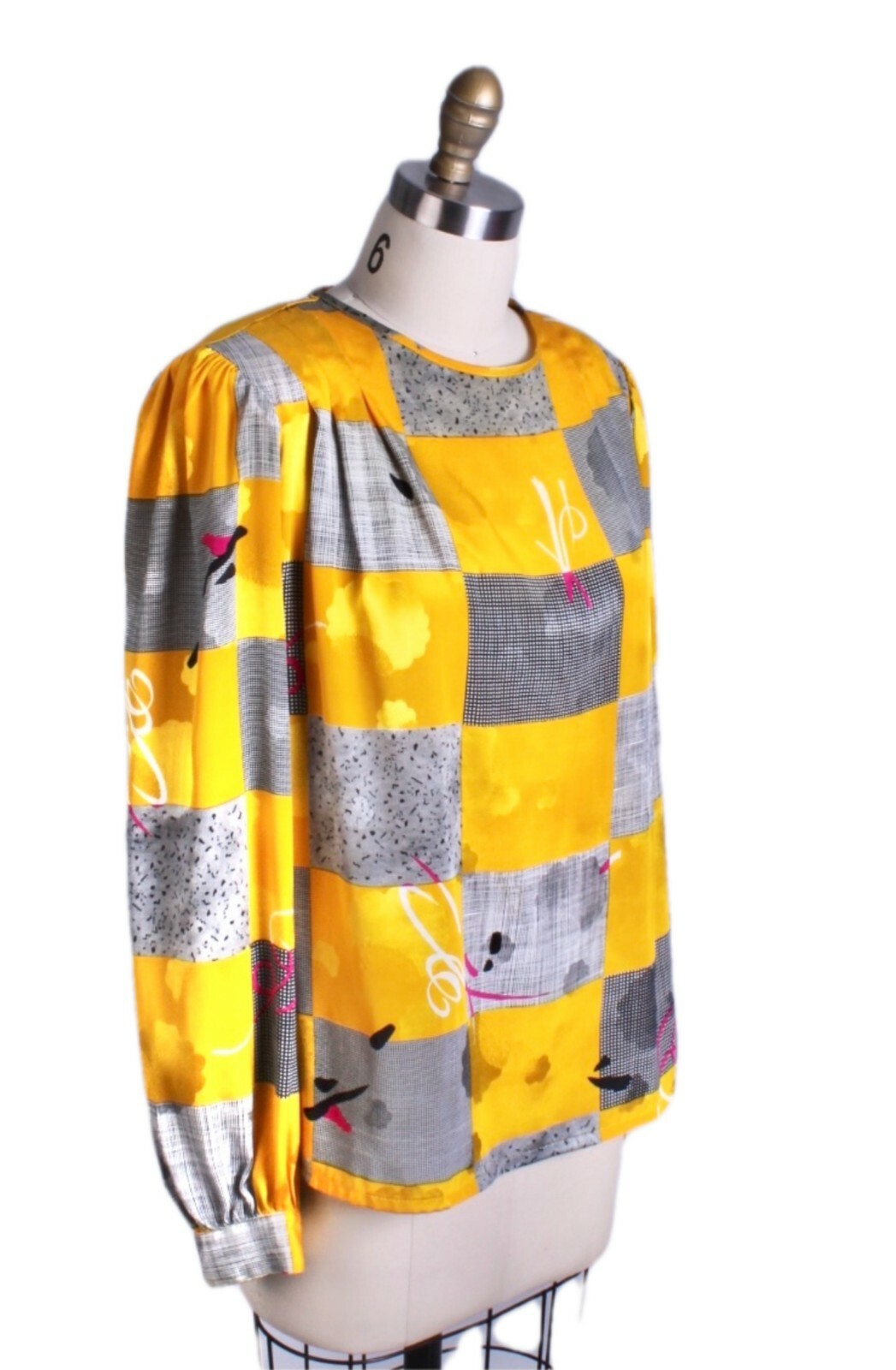 Vintage Nicola Blouse Ultra 1980s Gold Checkerboard Abstract Poly Womens size 12 is in excellent condition, no stains, has shoulder pads and buttons at the neck in back. Perfect secretary blouse. Love the bright gold paired with black and white checkerboard for a real one of a kind for the office!
