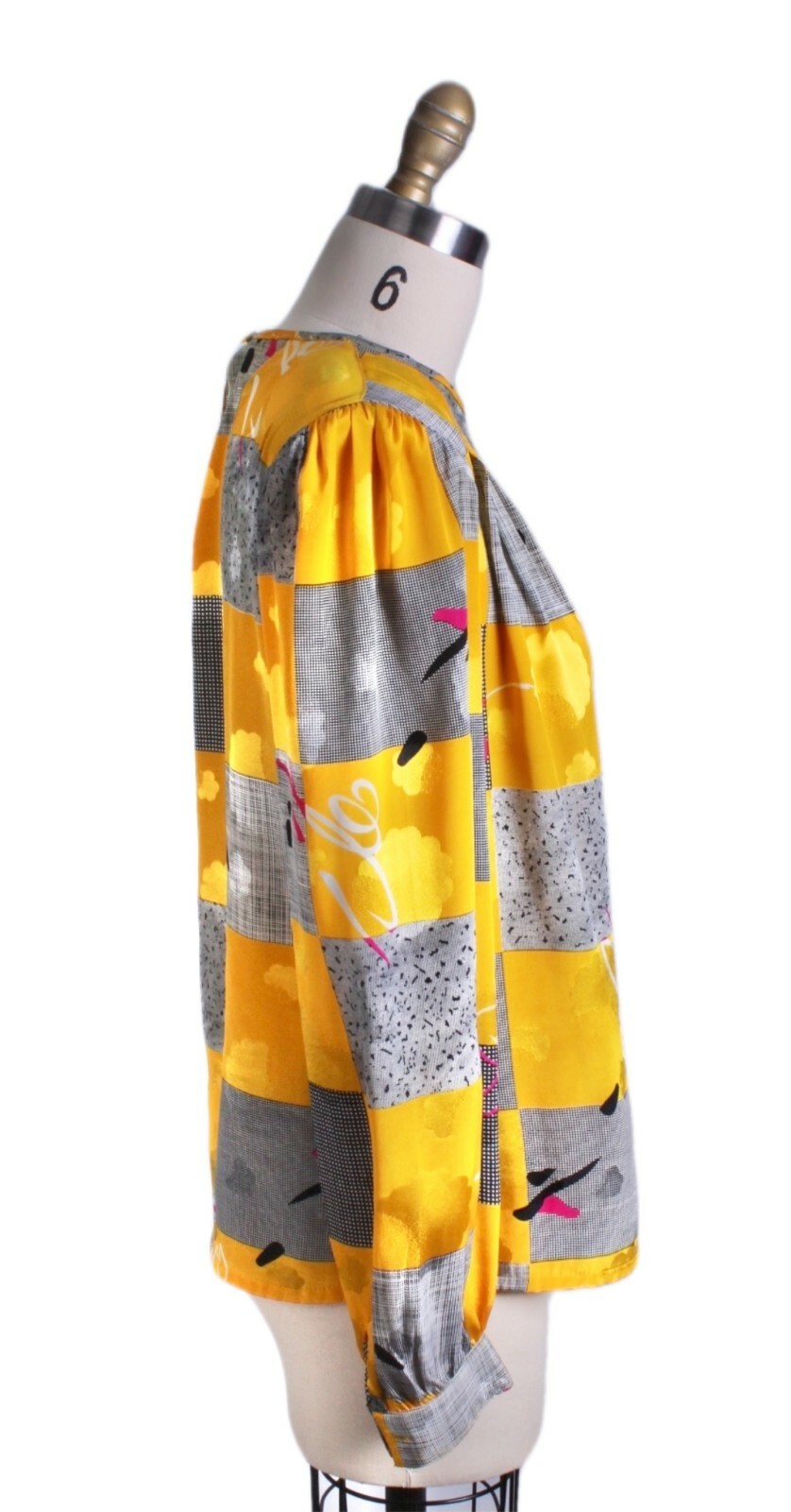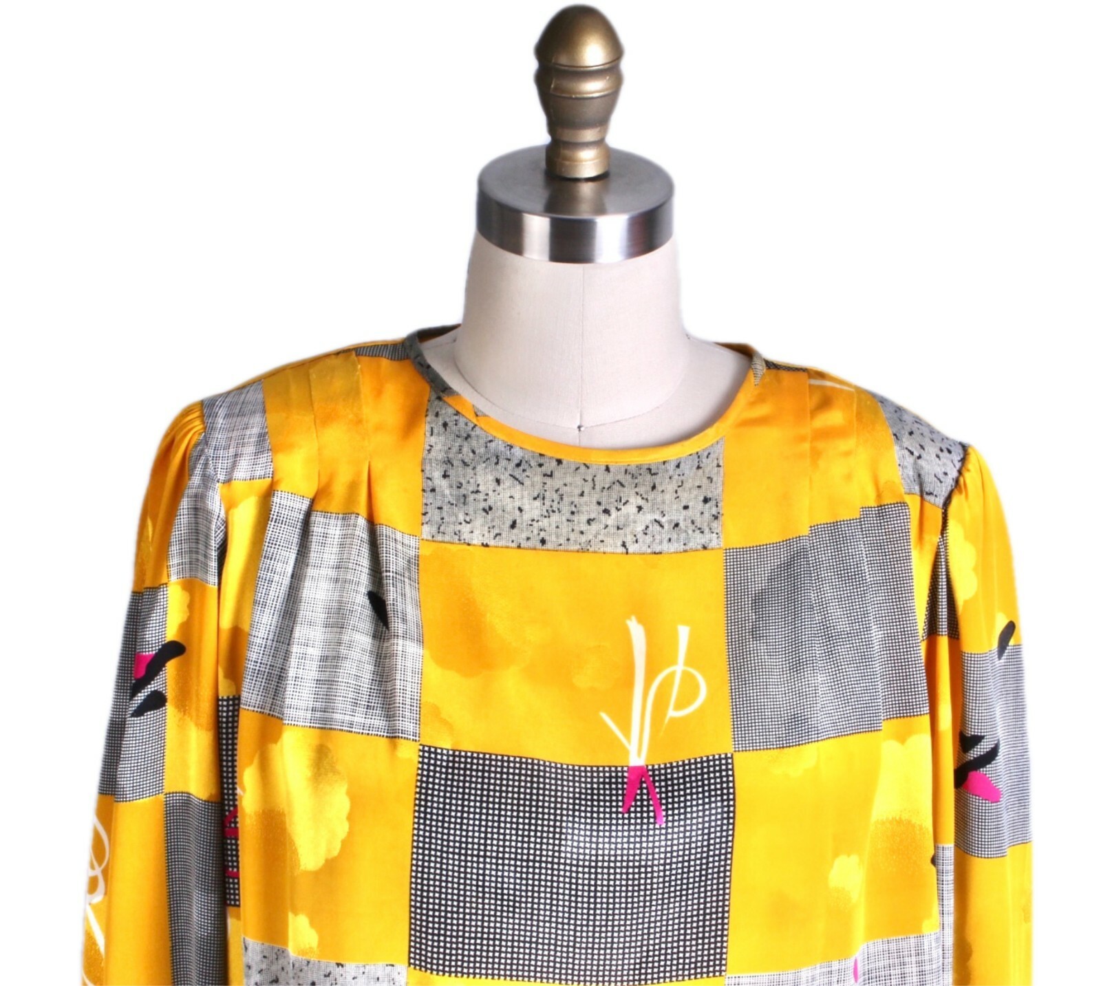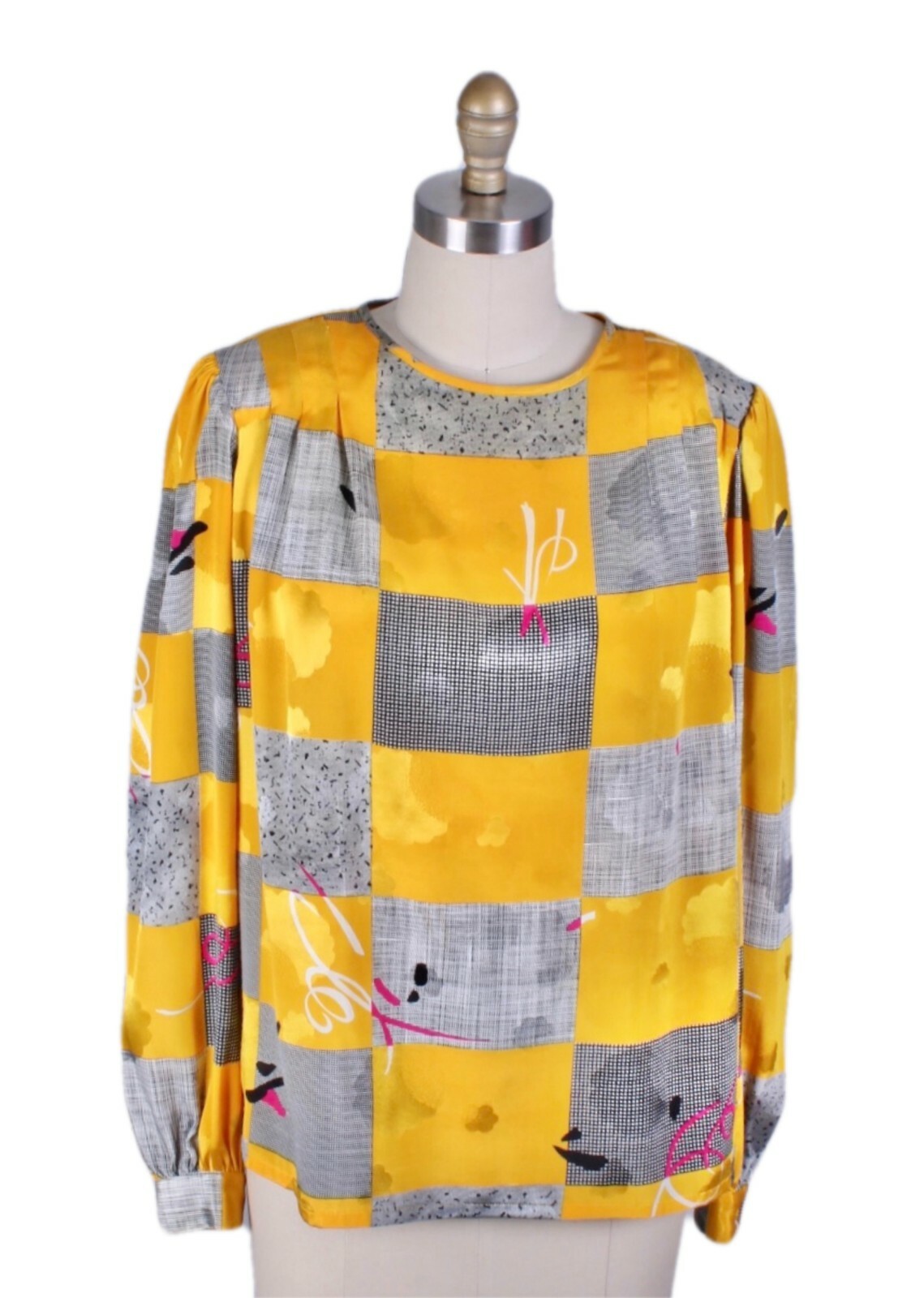 Vintage Nicola Blouse Ultra 1980s Gold Checkerboard Abstract Poly Womens size 12 is in excellent condition, no stains, has shoulder pads and buttons at the neck in back. Perfect secretary blouse. Love the bright gold paired with black and white checkerboard for a real one of a kind for the office!
