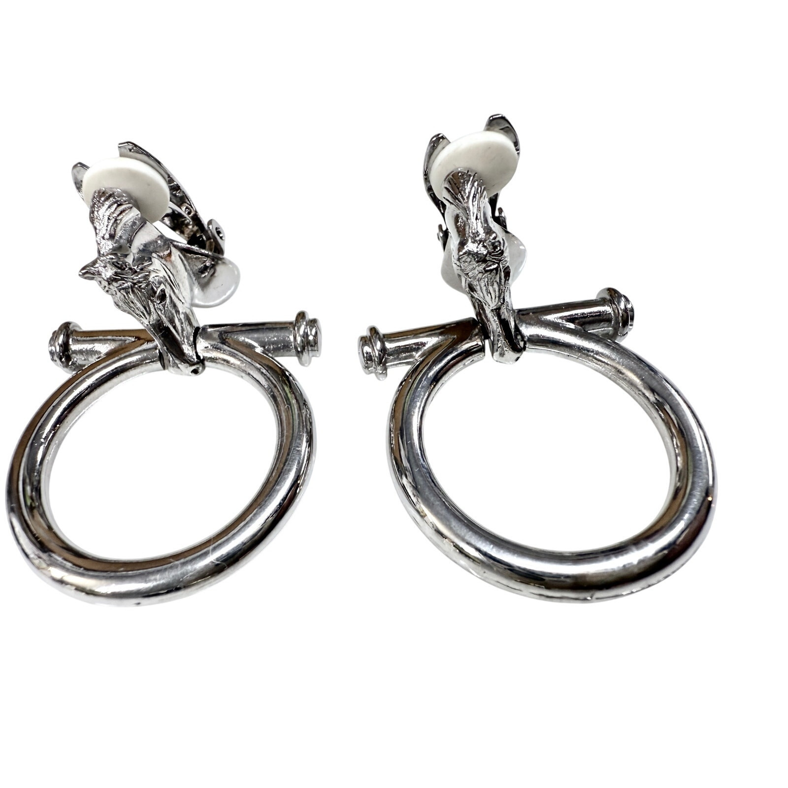 Exquisitely crafted, these rare, authentic signed Paolo Gucci horse bit hoop door knocker clip-on earrings showcase exceptional vintage allure. Renowned for his remarkable designs, Paolo Gucci has captivated collectors with his vintage jewelry. These particular earrings are truly unique. They exhibit minor wear and scratches typical of their age, with the earring cushions absent. Nonetheless, the clip-ons remain secure. The metal content is unmarked, making these pieces even more collectible and extraordinary!