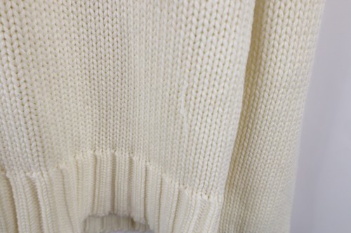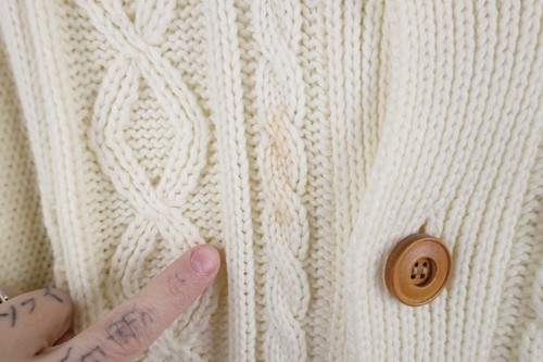 Blemish front and left sleeve. Bottom button broken. Fabric pull front top