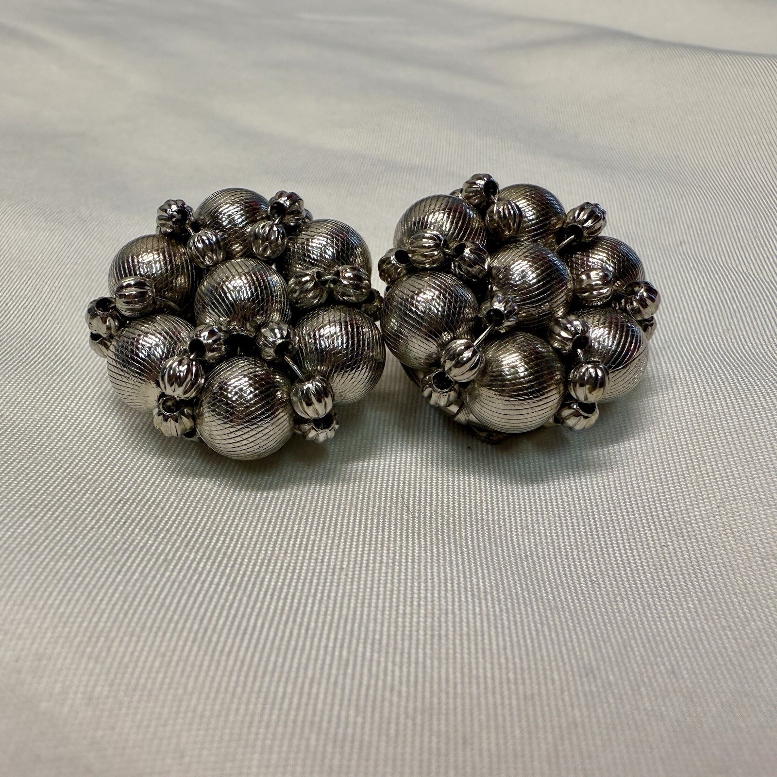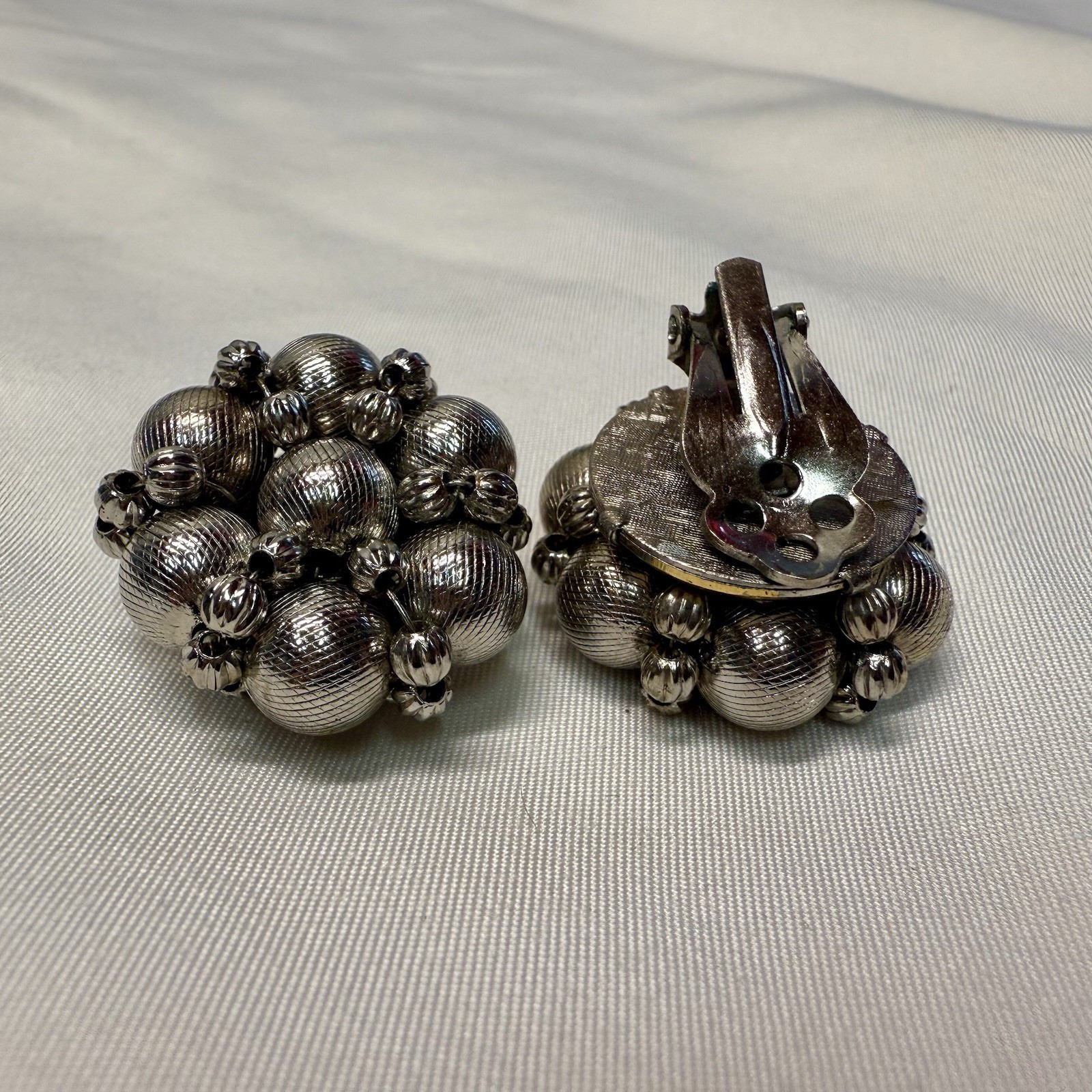 Vintage Silver Ball Cluster Clip Earrings Retro Textured Beads 60s Statement