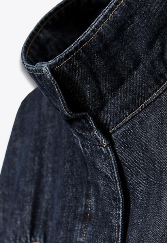 Jacket denim with a lapel collar and buttons. Long batwing sleeves with cuffs. Welt pockets at the front. Adjustable elastic hem with drawstrings. Front zip and snap-button fastening hidden by a placket.