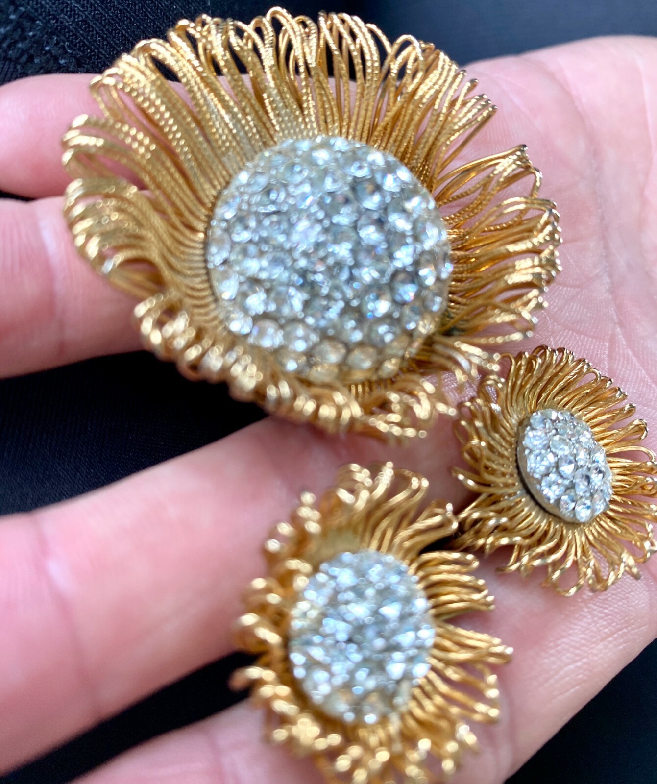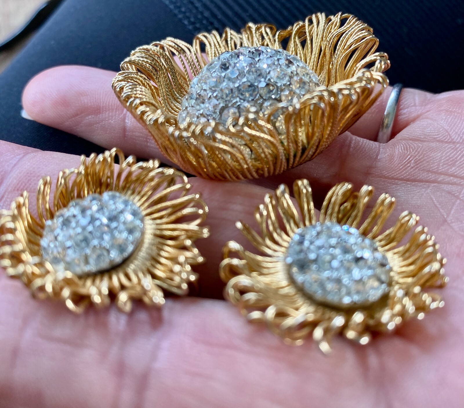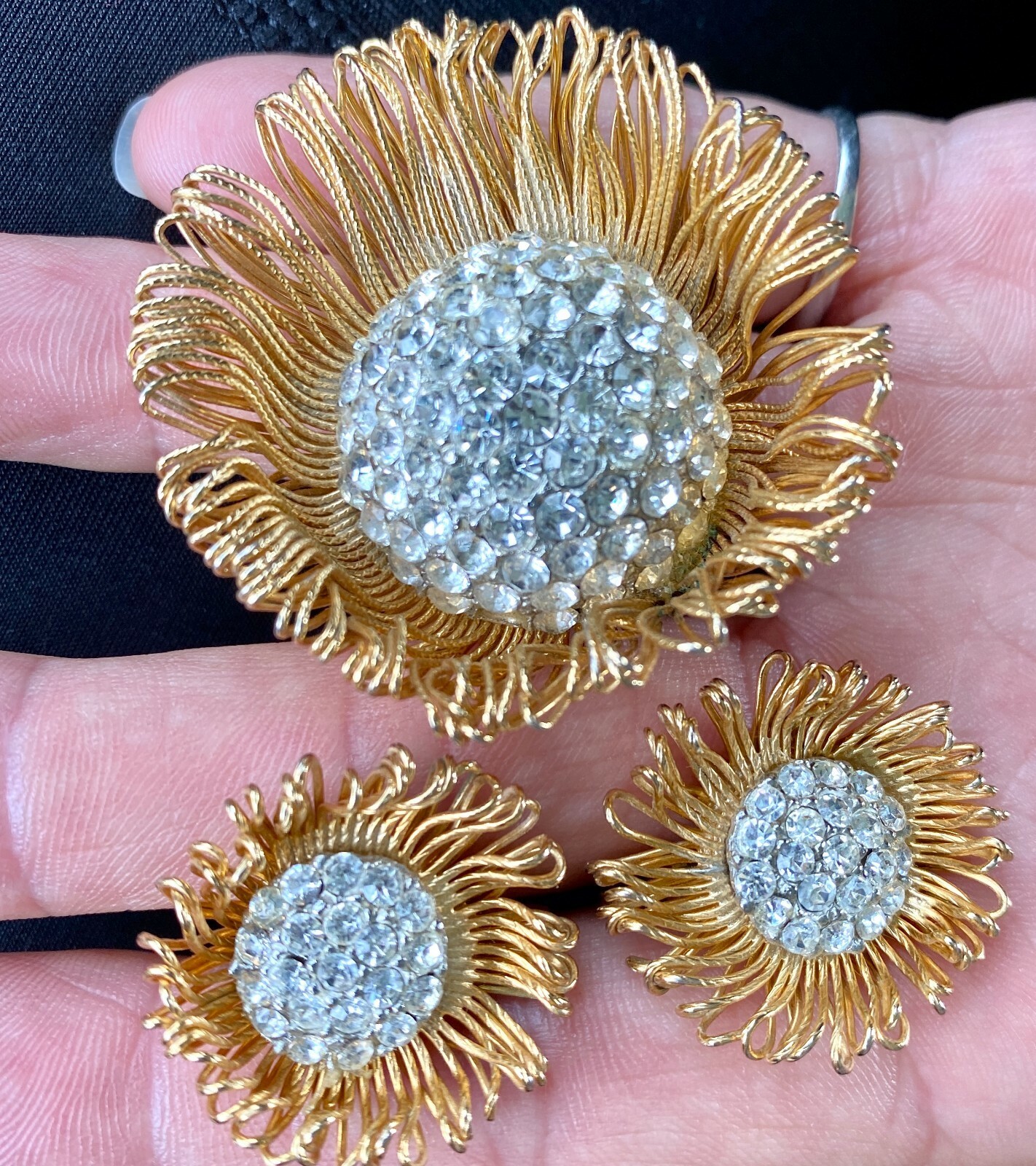 MCM Chrysanthemum Gold Wire Brooch & Ears Rhinestones 1950's Clipback VTG