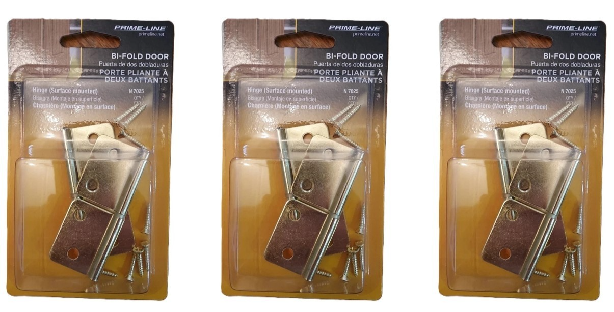 The Prime-Line N7025 bi-fold non-mortise door hinge is a surface-mounted hardware solution designed for quick, tool-efficient installation on interior wood bi-fold doors. Made from durable steel with a brass-plated finish, each 3-inch hinge features a fixed pin and non-self-closing action, ensuring smooth, quiet operation without automatic closure. The non-mortise design eliminates the need for recessing into door or jamb edges, making it ideal for retrofits, repairs, or new installations where time and simplicity matter. Each hinge includes four pre-drilled mounting holes and comes with all necessary screws. Sold in a 3-pack (each pack contains three sets of 2 hinges, totaling 6 hinges), this product supports full installation on three standard bi-fold door pairs. Note: not recommended for use with ACQ-treated lumber due to potential corrosion.