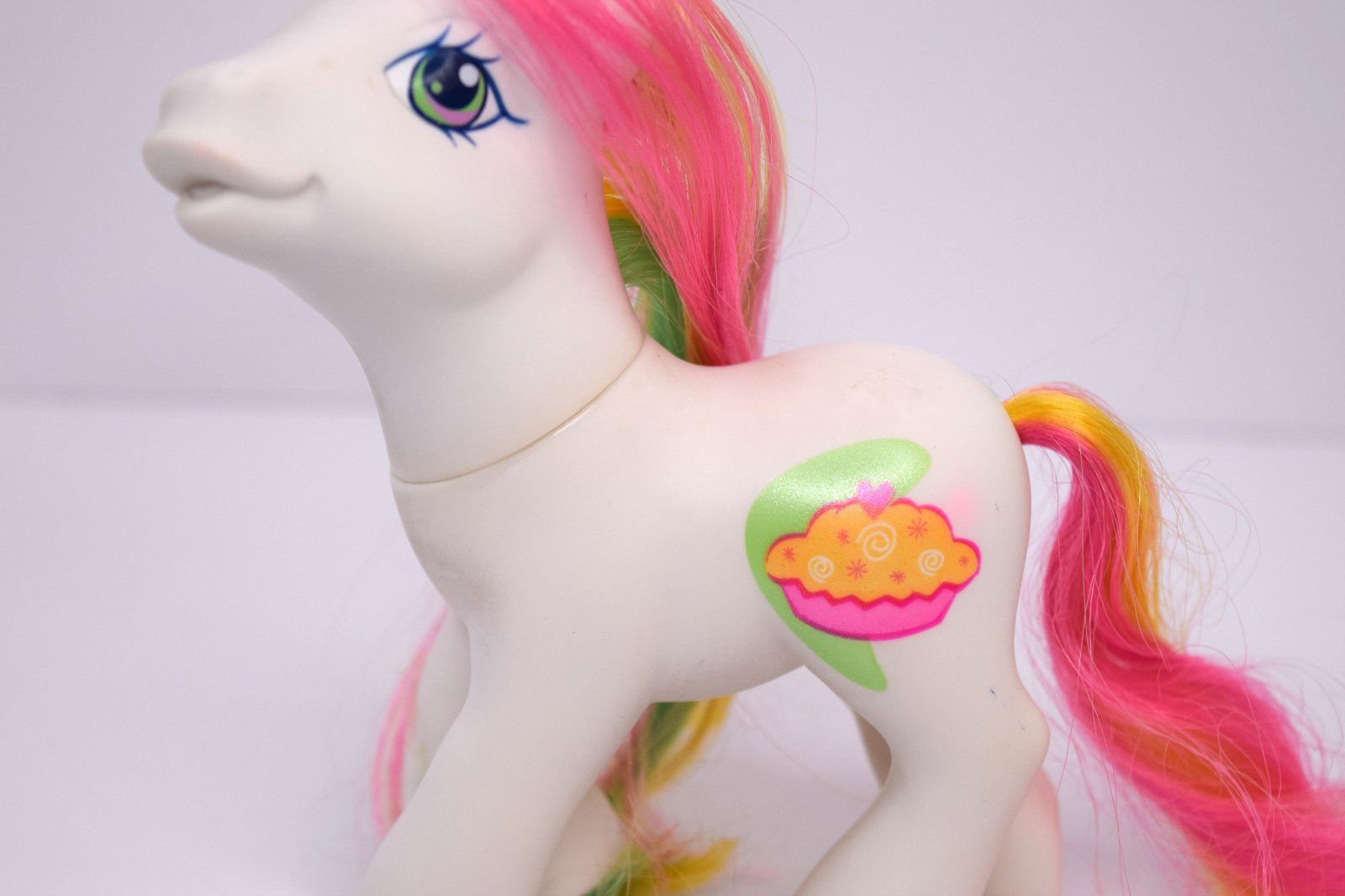 My Little Pony G3 Coconut Cream Pony 2004 Hasbro. Pre-owned in good condition. Some light signs of wear and some discoloration at the feet. See all photos for details and condition. Will ship USPS Ground Advantage.