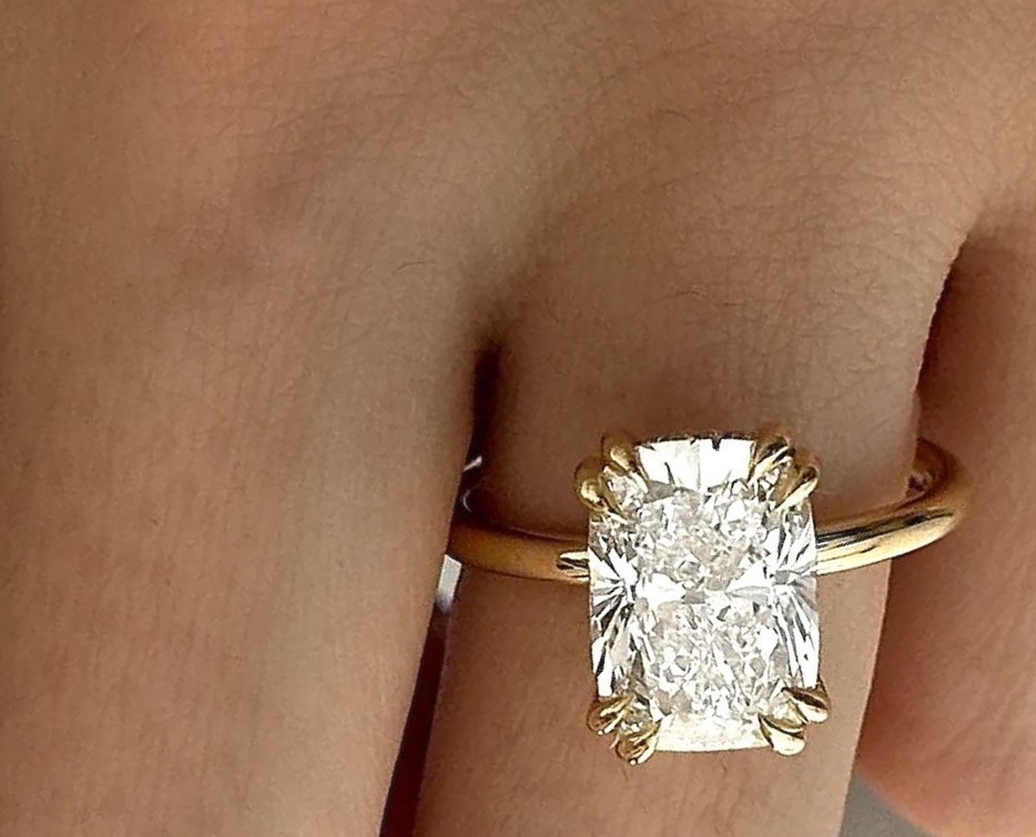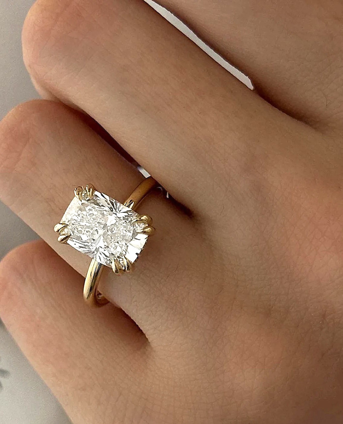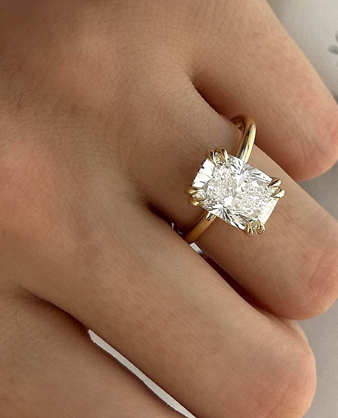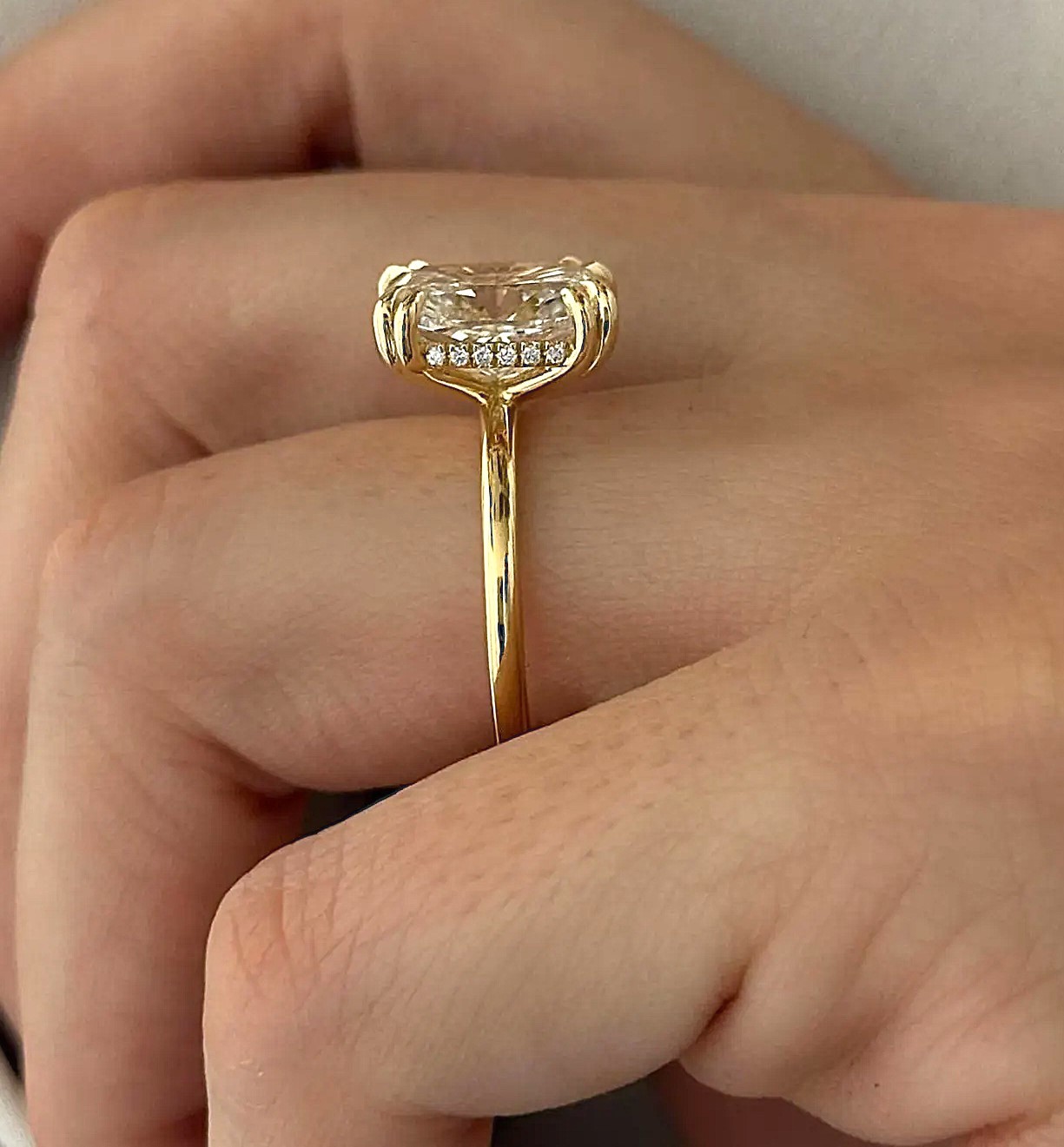This exquisite engagement ring features a stunning 4ct. Elongated Cushion cut Lab grown diamond VVS1 clarity and G color,11.35 - 8.26 x 5.55 MMat the center. Meticulously crafted to capture the brilliance and fire of a natural diamond. Set in luxurious 14K yellow gold with double claw prong set style, it has hidden halo round diamonds 0.10 cttw. This ring offers a timeless elegance that is perfect for celebrating your love.