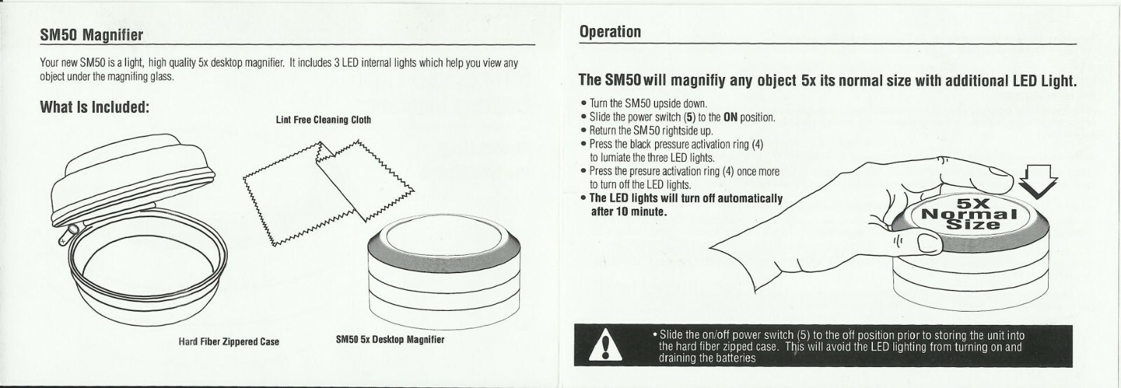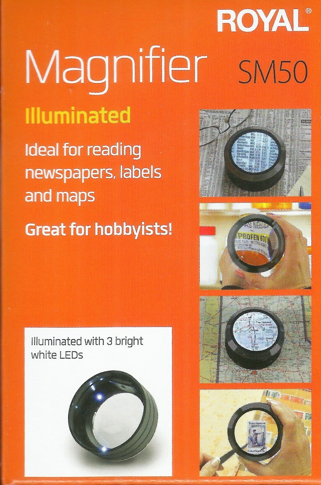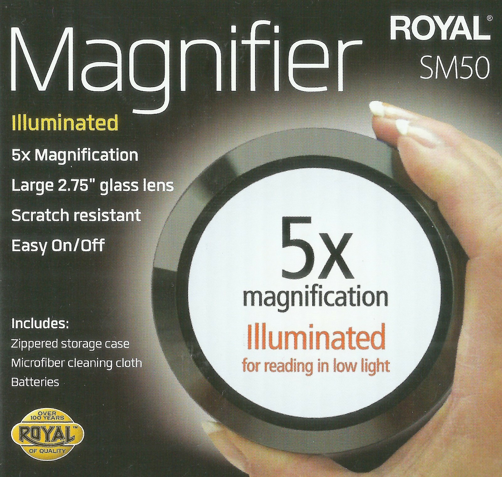 FOR SALE IS ONE (1) NEW 5x (five power) LARGE ROUND MAGNIFIER LOUPE made of Real Glass MANUFACTURED BY ROYAL CONSUMER INFORMATION PRODUCTS MPN SM50 ALTERNATE MPN 69190P UPC# 022447691900. GENEROUS 2 3/4" diameter REAL GLASS LENS IS SCRATCH RESISTANT. THIS FIVE POWER (5X) HIGH QUALITY MAGNIFIER LOUPE FEATURES THREE (3) LED LIGHTS TO ILLUMINATE YOUR VIEWING AREA. USES TWO (2) CR2016L WAFER TYPE BATTERIES WHICH ARE INCLUDED. THIS HIGHEST QUALITY MAGNIFIER BY ROYAL ALLOWS FOR USE IN LOW LEVEL LIGHTING, EVEN IN BED. JUST PRESS THE LED LIGHT ACTIVATION RING ON TOP FOR ON, AND AGAIN FOR OFF. THE THREE LED LIGHTS WILL TURN OFF AUTOMATICALLY IN TEN MINUTES ALSO. THIS GREAT MAGNIFIER IS IDEAL FOR READING, MAP, NEWSPAPERS, LABELS, JEWELRY, STAMPS, WHEREVER A LOW(er) LEVEL MAGNIFICATION IS REQUIRED. REDUCE EYE STRAIN AND SQUINTING, ALLOWS FOR HANDSFREE VIEWING, JUST MOVE THE MAGNIFIER OVER THE AREA YOU WANT TO MAGNIFY. MADE BY ROYAL CONSUMER INFORMATION PRODUCTS INCORPORATED (makers of the royal typewriter and royal scales). MANY MAGNIFYING GLASSES SOLD ARE NOT GLASS. ISN'T THAT JUST PLAIN CRAZY. THIS RELIABLE MAGNIFYING LOUPE IS REAL GLASS AND ALLOWS YOU TO READ SMALL PRINT WITH BOTH EYES. STURDY AND LIGHTWEIGHT, INCLUDES A HARD FIBER ZIPPERED STORAGE CASE, CLEANING CLOTH AND BATTERIES. THIS MAGNIFYING LOUPE LETS YOU READ SMALL PRINT EASILY, PERFECT FOR MAPS, SMALL PRINT OWNERS MANUALS, LIMITED VISION, ETC. YOU WILL RECEIVE ONE (1) REAL GLASS 5x MAGNIFYING LOUPE SHIPPED BY USPS.....