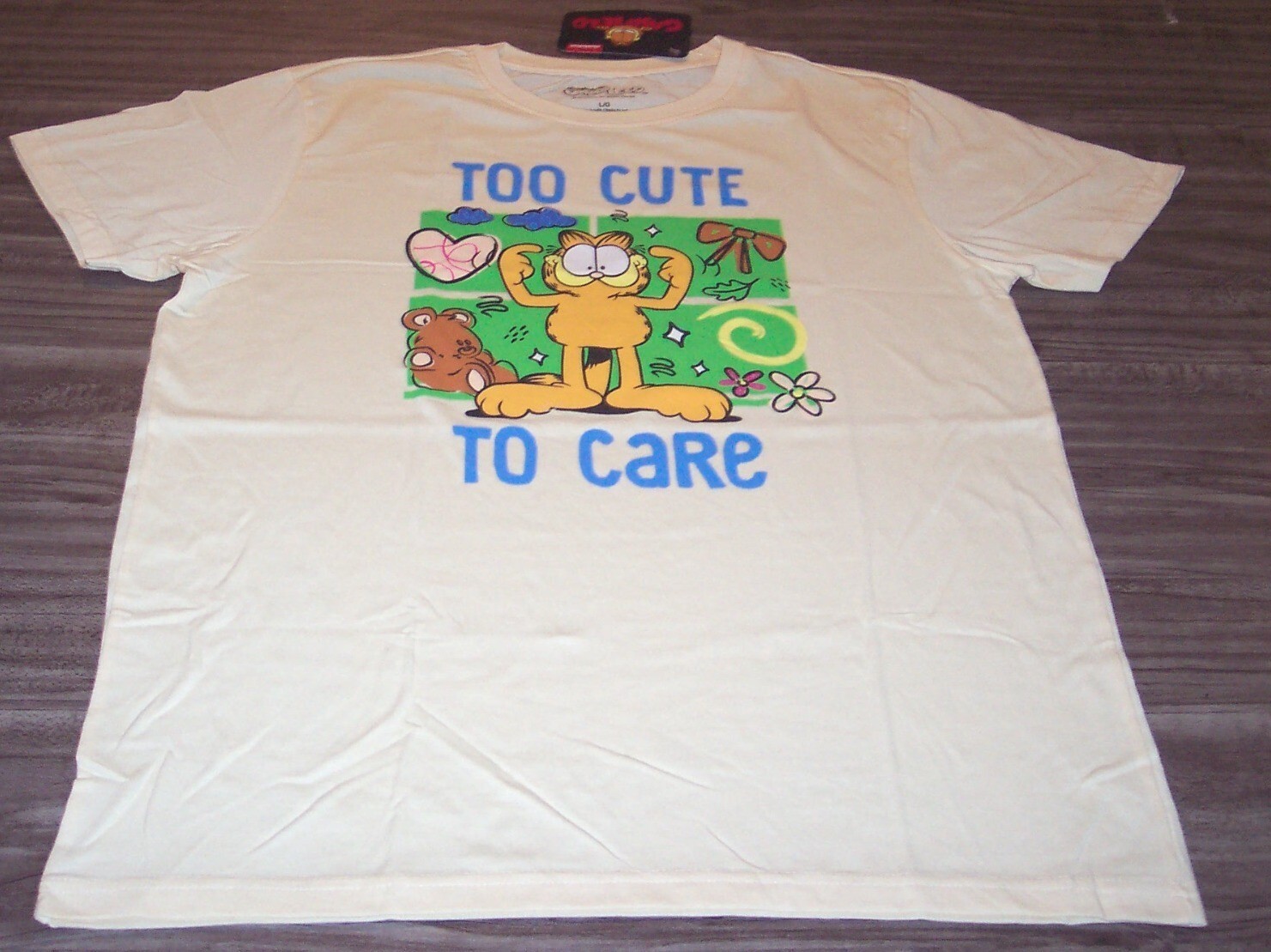 This is a GARFIELD Too Cute To Care T-shirt. It is a size LARGE, and it is NEW with the tag. It is 22 inches from armpit to armpit and 30 inches in length. Combine auctions to save on shipping. AD