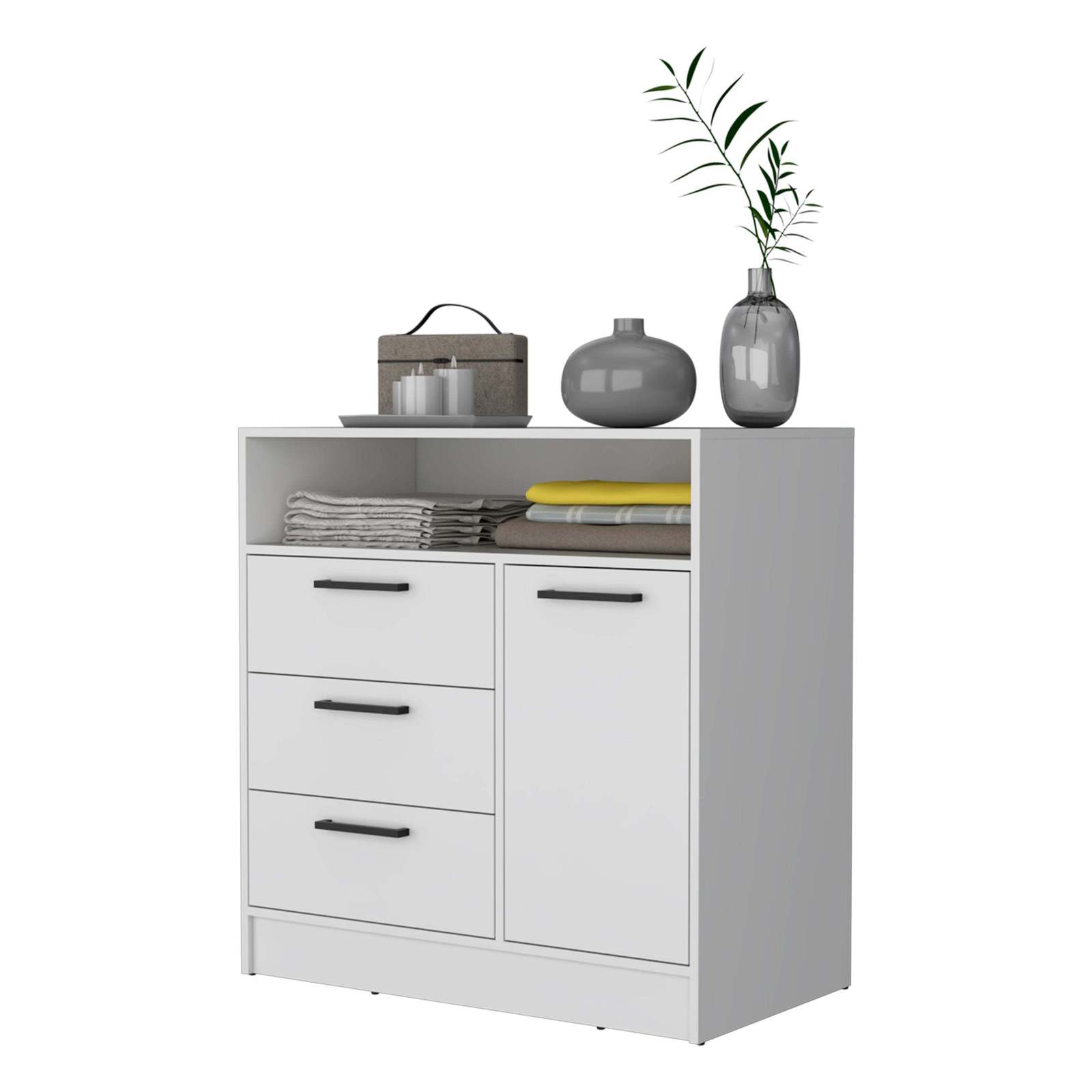Featuring three spacious drawers and a single-door cabinet with inner storage shelves, this dresser offers ample storage space for small items, while the top open shelf provides additional surface space for decorating with plants or knick-knacks. Crafted from durable manufactured wood, the dresser combines beauty and longevity, making it a timeless addition to any room.