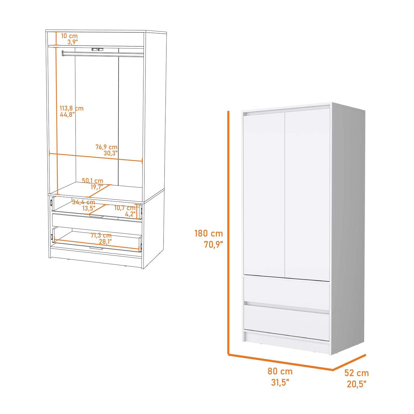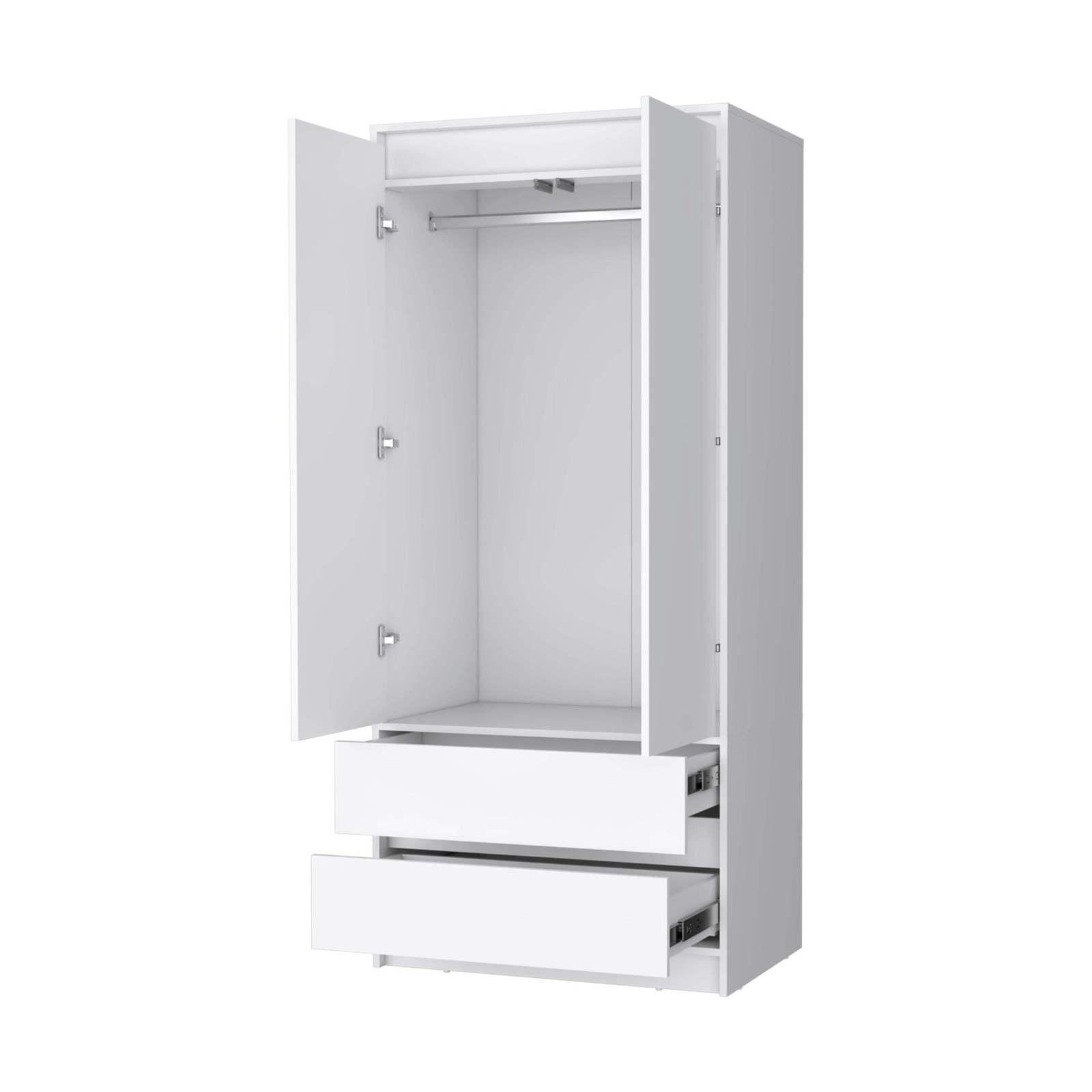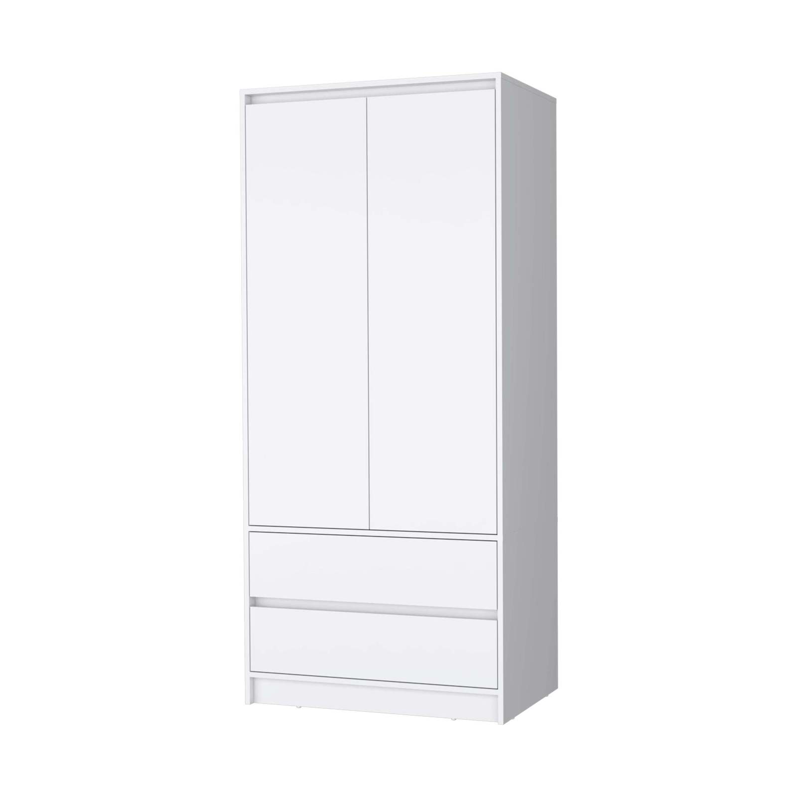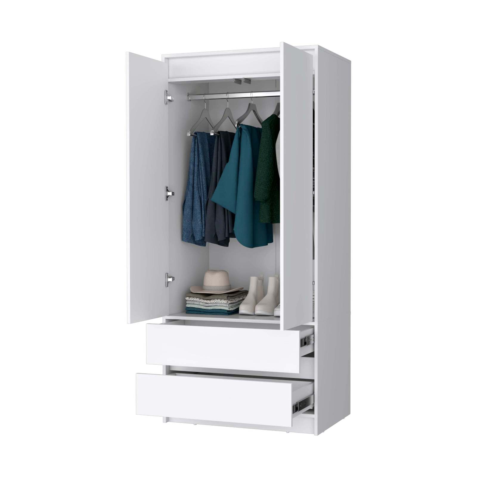 Introducing a 2-drawer armoire, a space-saving yet stylish addition to your bedroom ensemble. Featuring two wide doors with an interior hanging rod for clothing storage, along with two spacious drawers, this armoire offers a streamlined solution to keep your wardrobe organized and neatly concealed, all while adding a touch of sophistication with its elegant white manufactured wood finish.