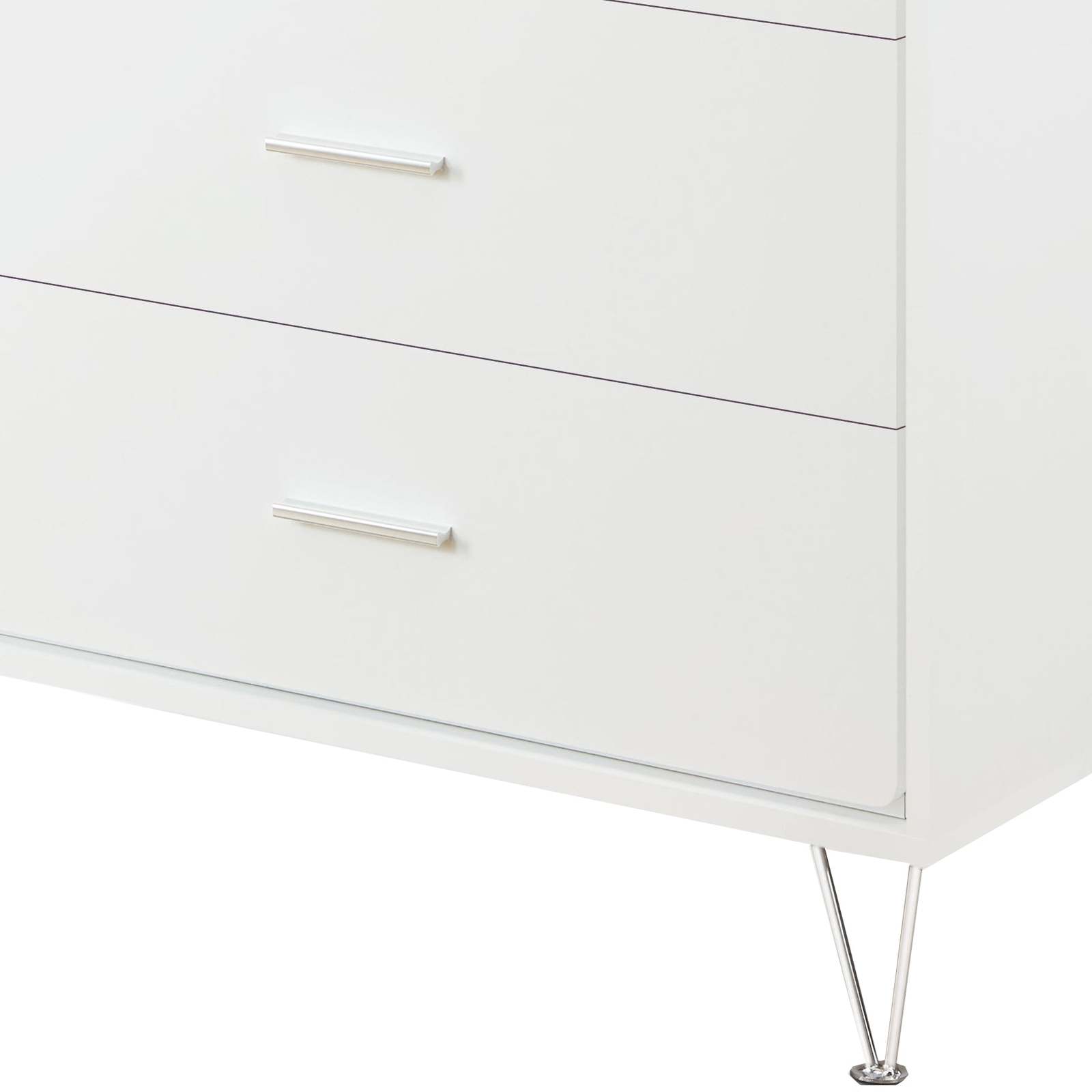 This piece combines 5 spacious drawers, a solid wooden case-frame, and stylish chrome-finished metal legs, along with side metal glide drawers for effortless operation
