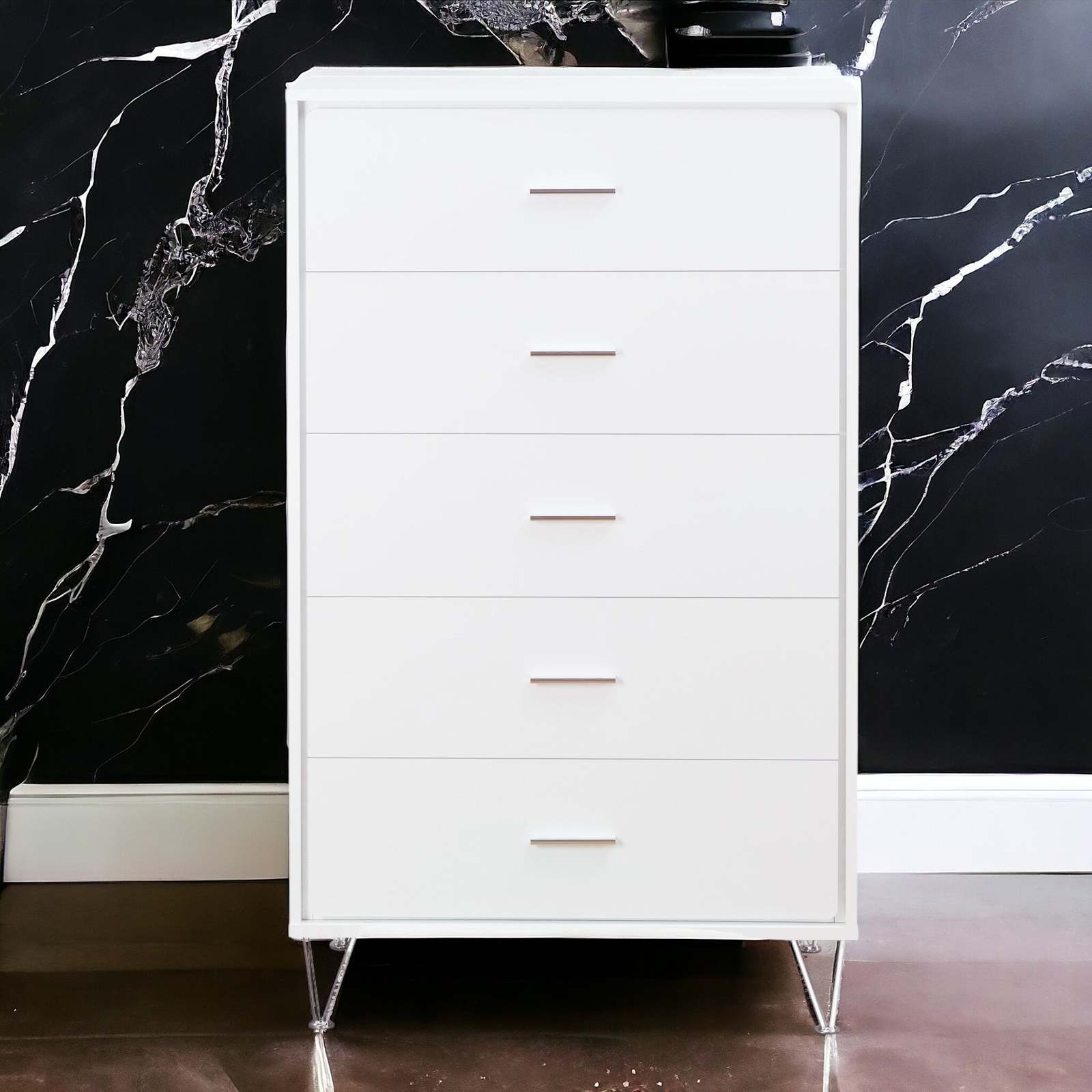 Featuring 5 drawers, a durable wooden case-frame, and chic chrome-finished metal legs, this item is equipped with side metal glide drawers for convenient organization