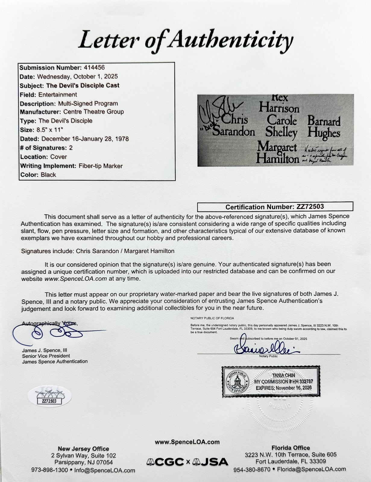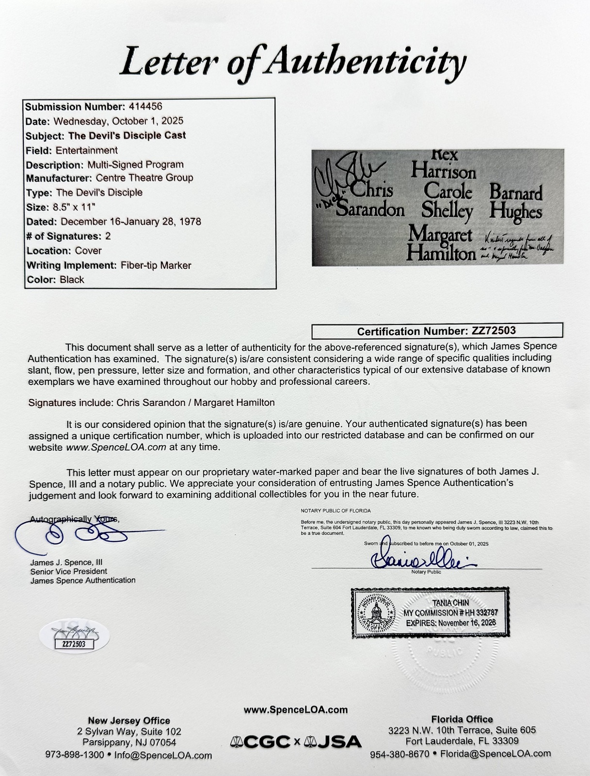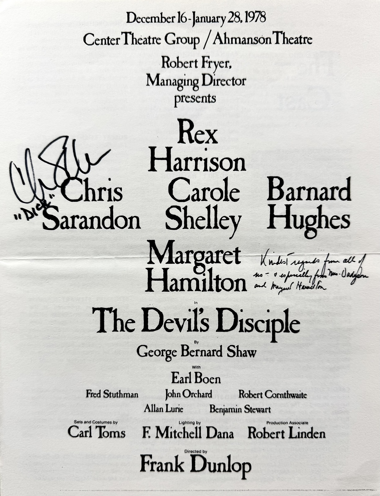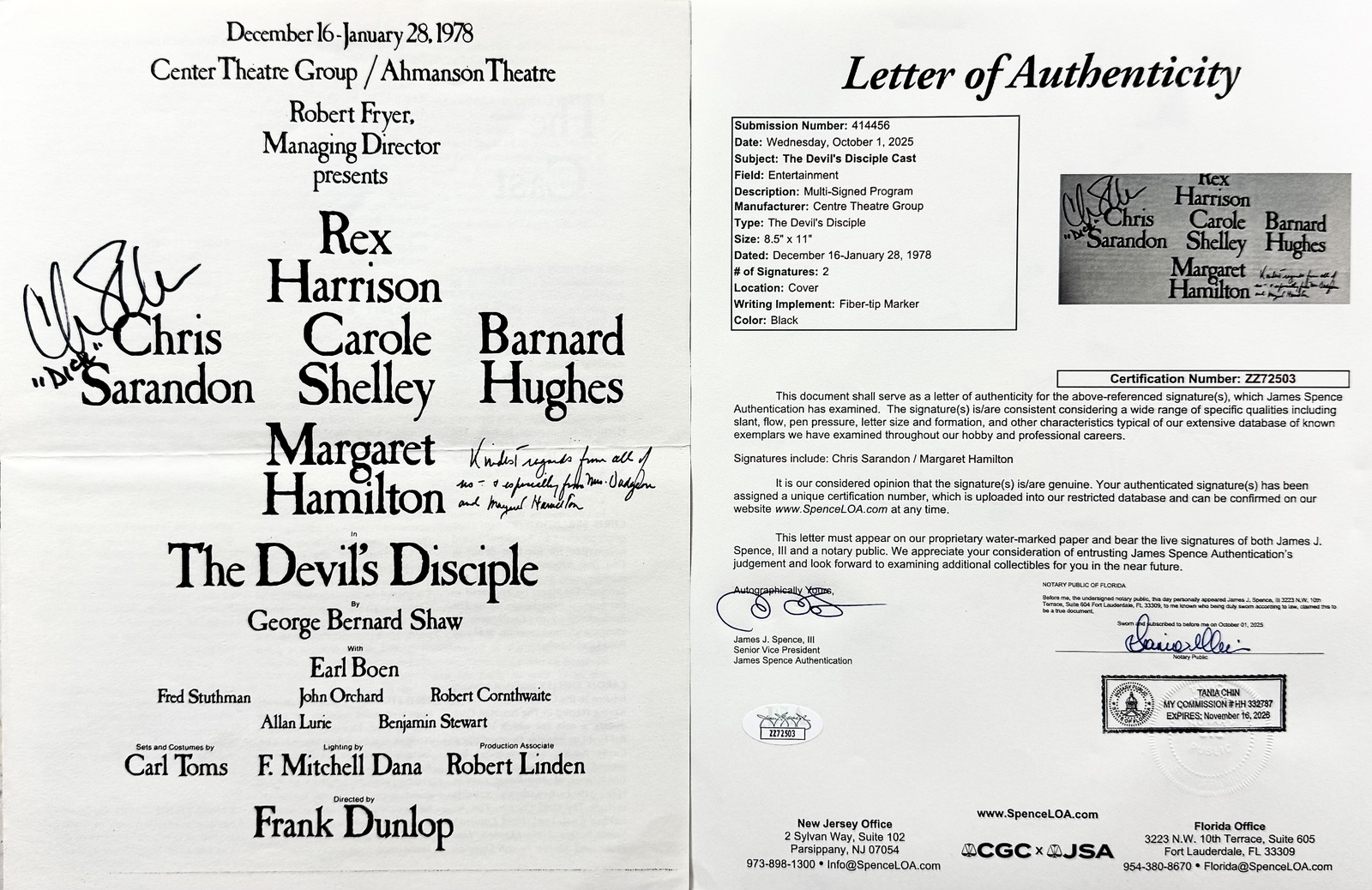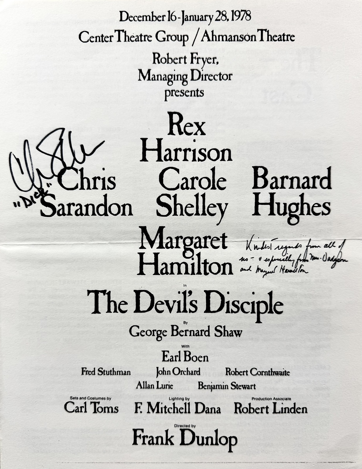 Margaret Hamilton (December 9,1902 - May 16,1985) autographed 1978 The Devil's Disciple theatre program signed boldly in black fiber-tip marker and inscribed Kindest regards from all of us - especially from Mrs. Dudgeon and Margaret Hamilton. This program is also signed by Chris Sarandon who played Richard Dudgeon. These signatures have been authenticated by JSA James Spence authentication Certification Number: ZZ72503 and will come with the Letter of Authenticity you see in the scans. The overall size of this program is 8 1/2" x 11". Margaret Hamilton was an American actress and educator. She is best known for her portrayal of the Wicked Witch of the West and her Kansas counterpart Almira Gulch in the 1939 Metro-Goldwyn-Mayer film The Wizard of Oz. She also played Elaine Zacharides in William Castle's 13 Ghosts (1960) and Morticia's mother, Mrs. Frump, on T.V.'s "The Addams Family" (1965-1966). A former schoolteacher, she worked as a character actress in films for seven years before she was offered the role that defined her public image. In later years, Hamilton appeared in films and and made frequent cameo appearances on television sitcoms and commercials. Buy with confidence we have been selling autographs since 1992.