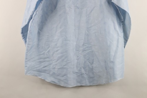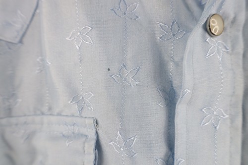 Stains front, cuffs. Collar, cuffs discolored. Right pocket ripped. Piling, fabric pulls. Color faded. Loose threads bottom hem. Made in USA