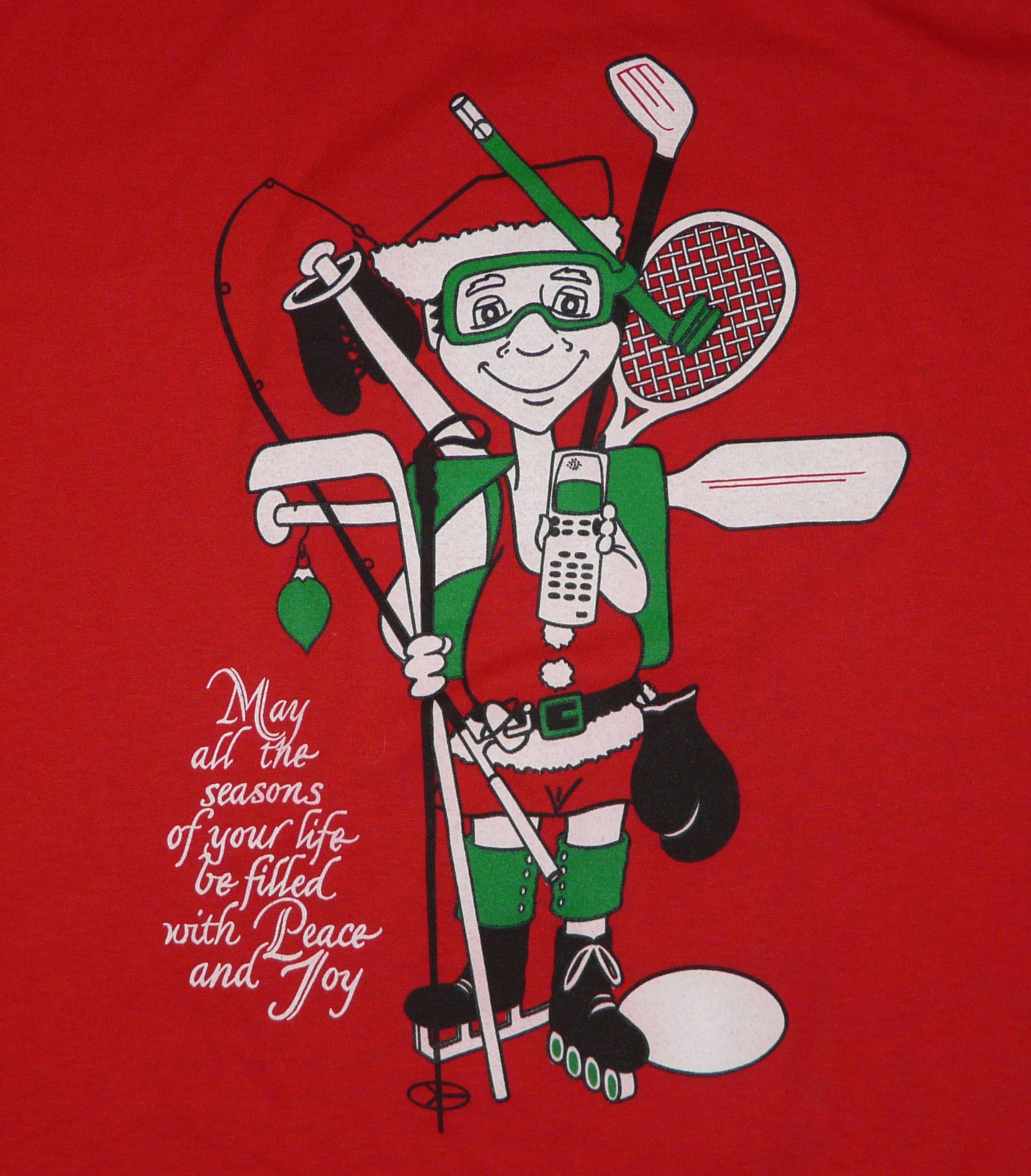 Front has a guy in a Santa suit with sports equipment of all sorts and he is holding a Nokia cell phone.
