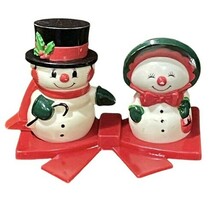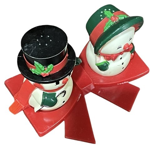 Vtg Christmas JSNY Mr & Mrs Snowman Salt Pepper Shaker 3 Piece Set Hong Kong