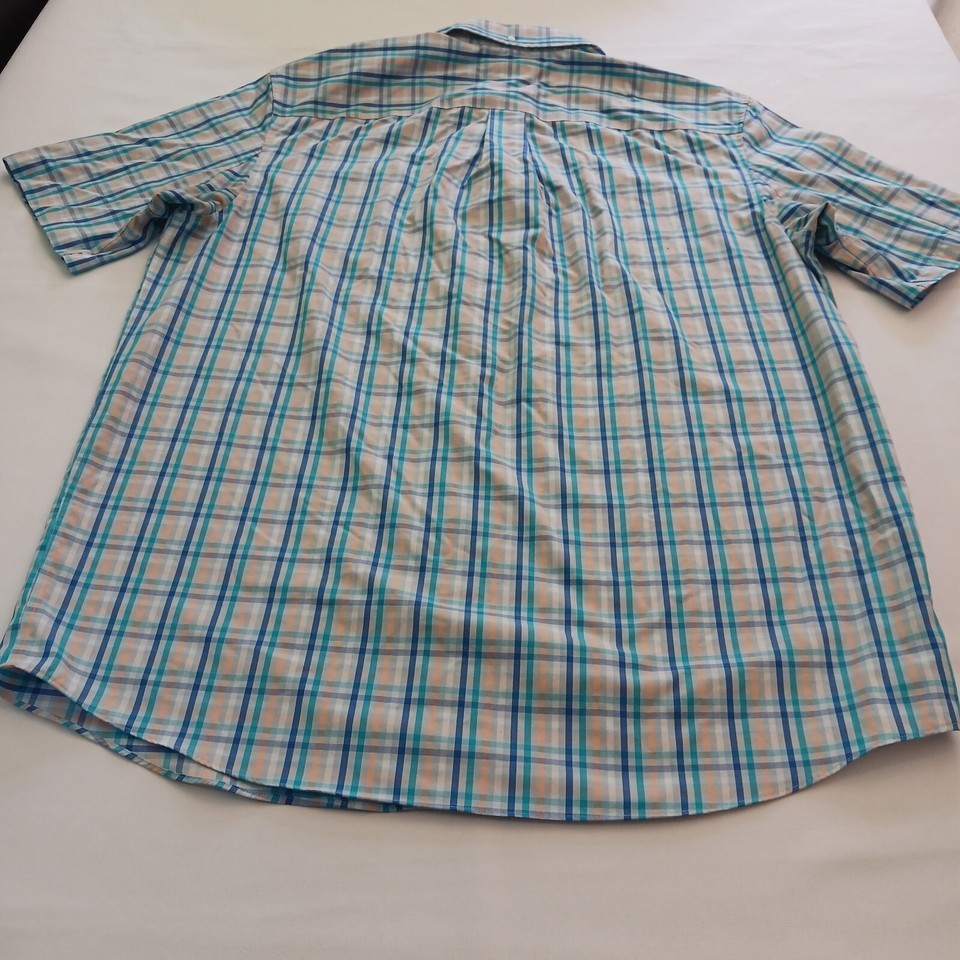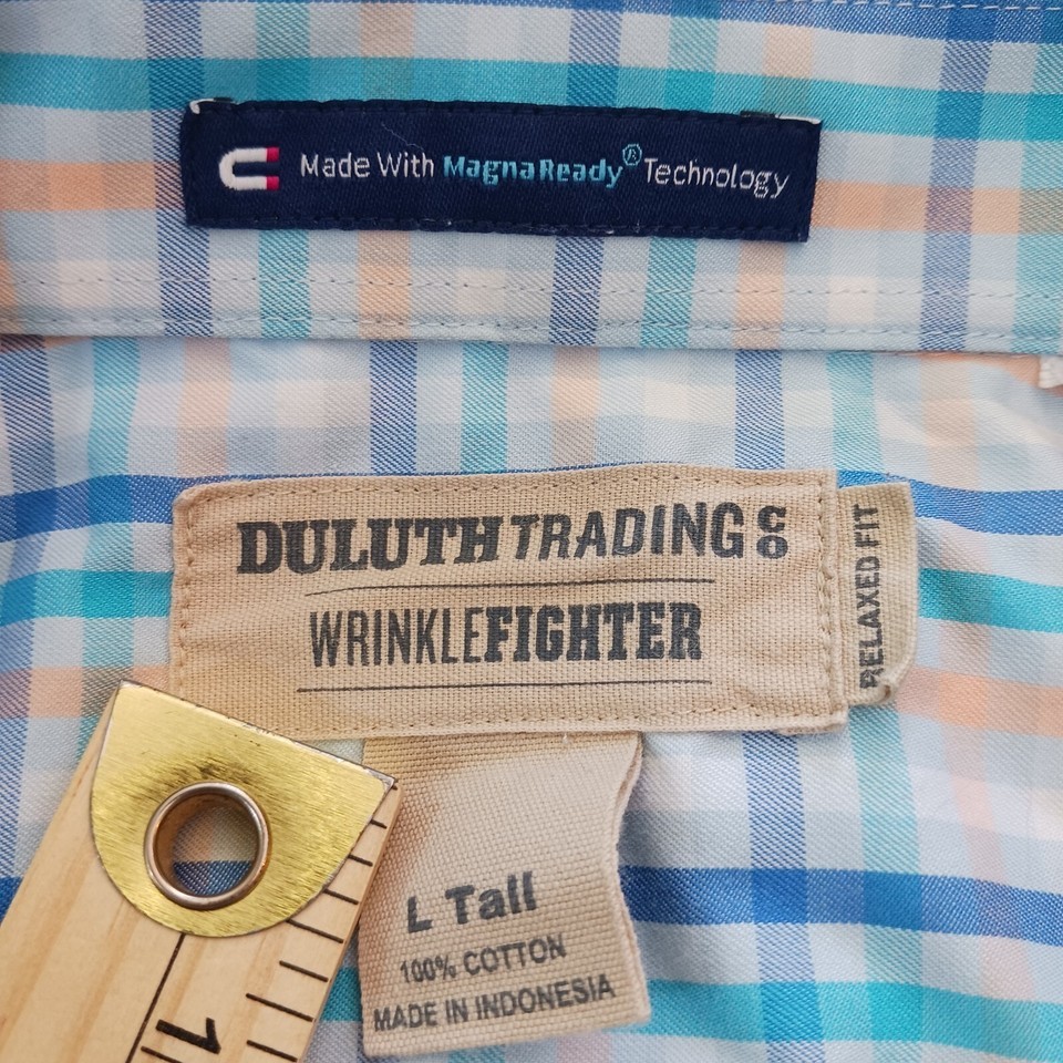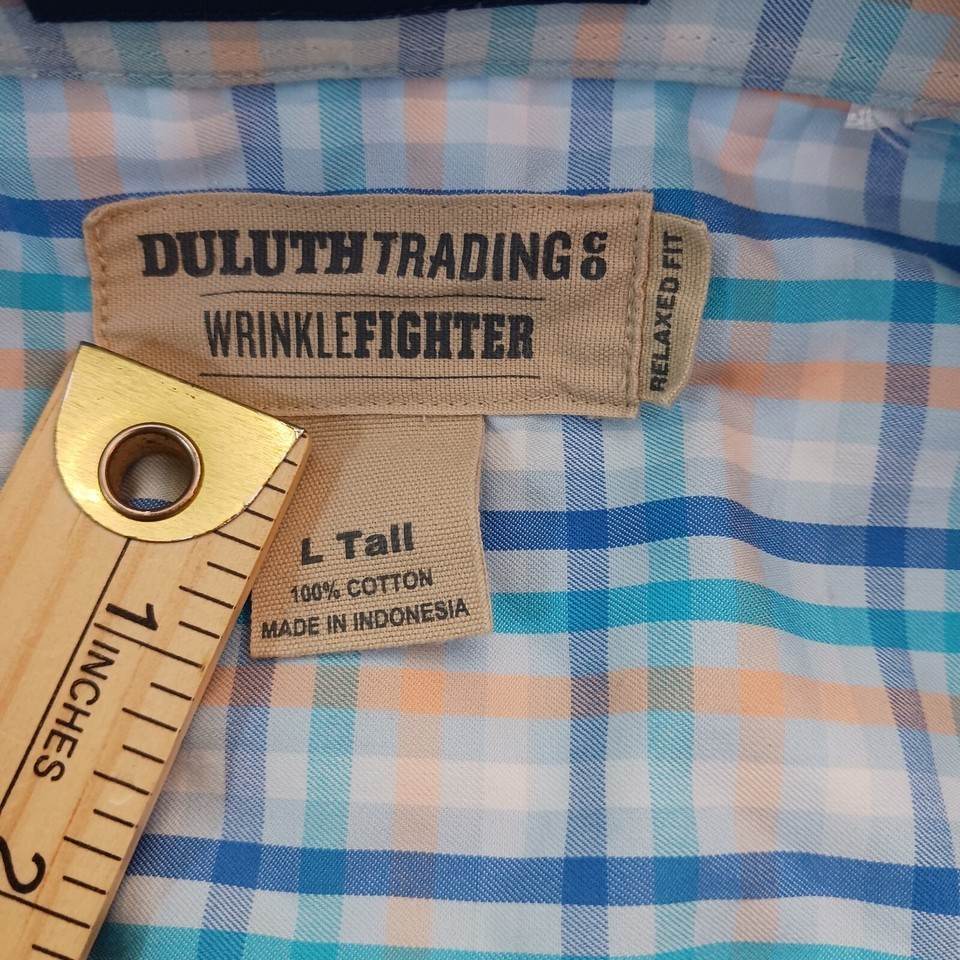 This is a men's short-sleeved button-down collar shirt from Duluth Trading Co. It is made of woven cotton fabric with a plaid pattern in multicolor. The shirt features a button-down collar, button closure, and pockets. It is designed for outdoor and casual occasions and is machine washable. The shirt is a regular fit and is available in size L Tall, which is a big and tall size. It is suitable for all seasons and is made in Indonesia.