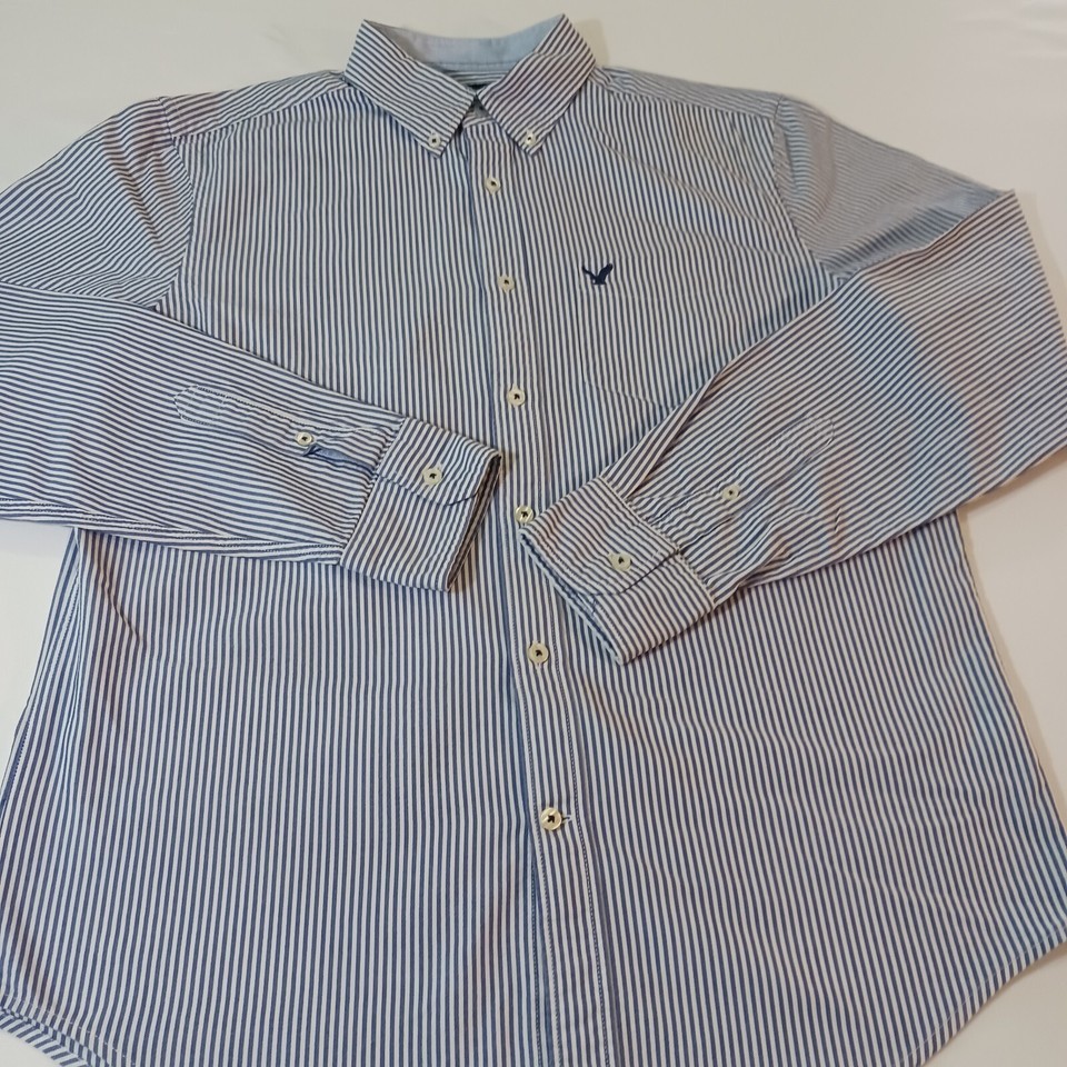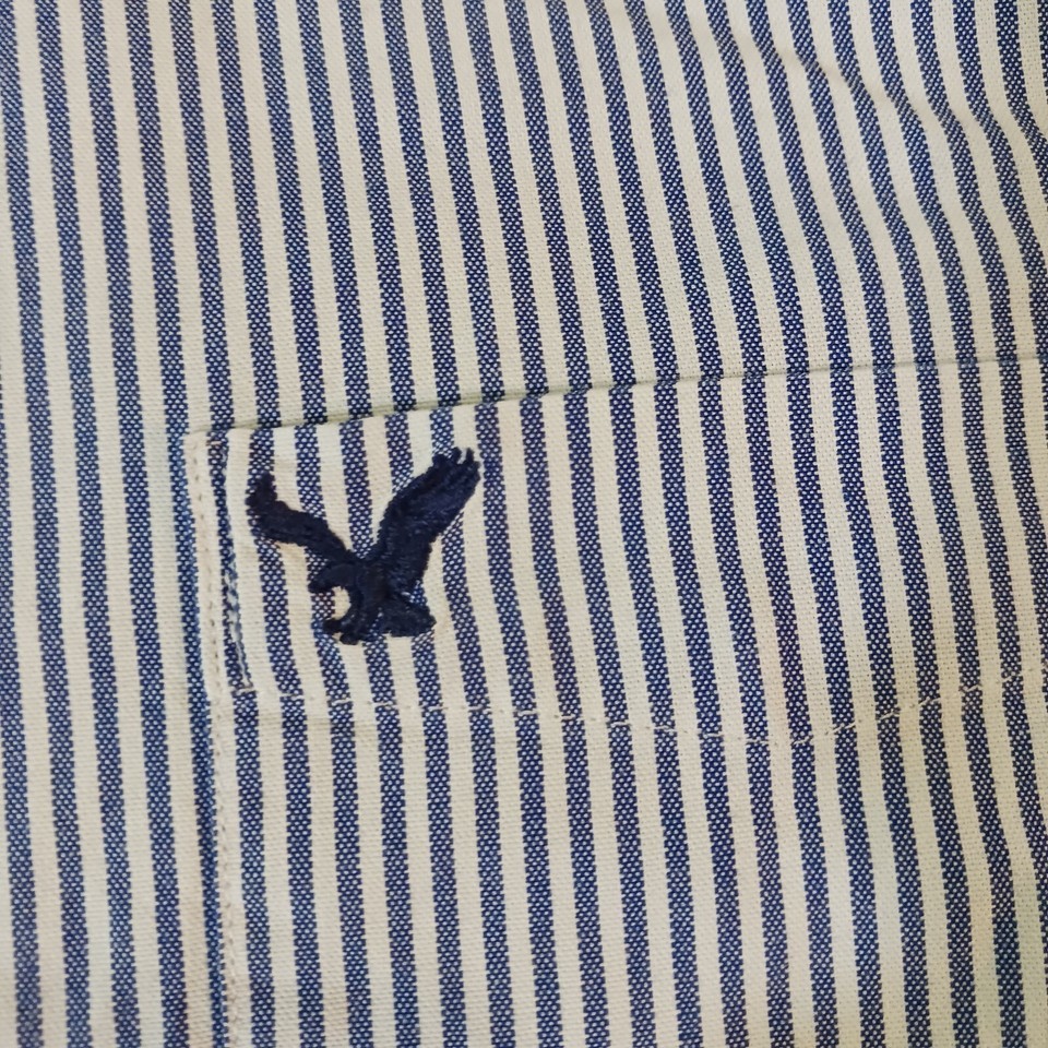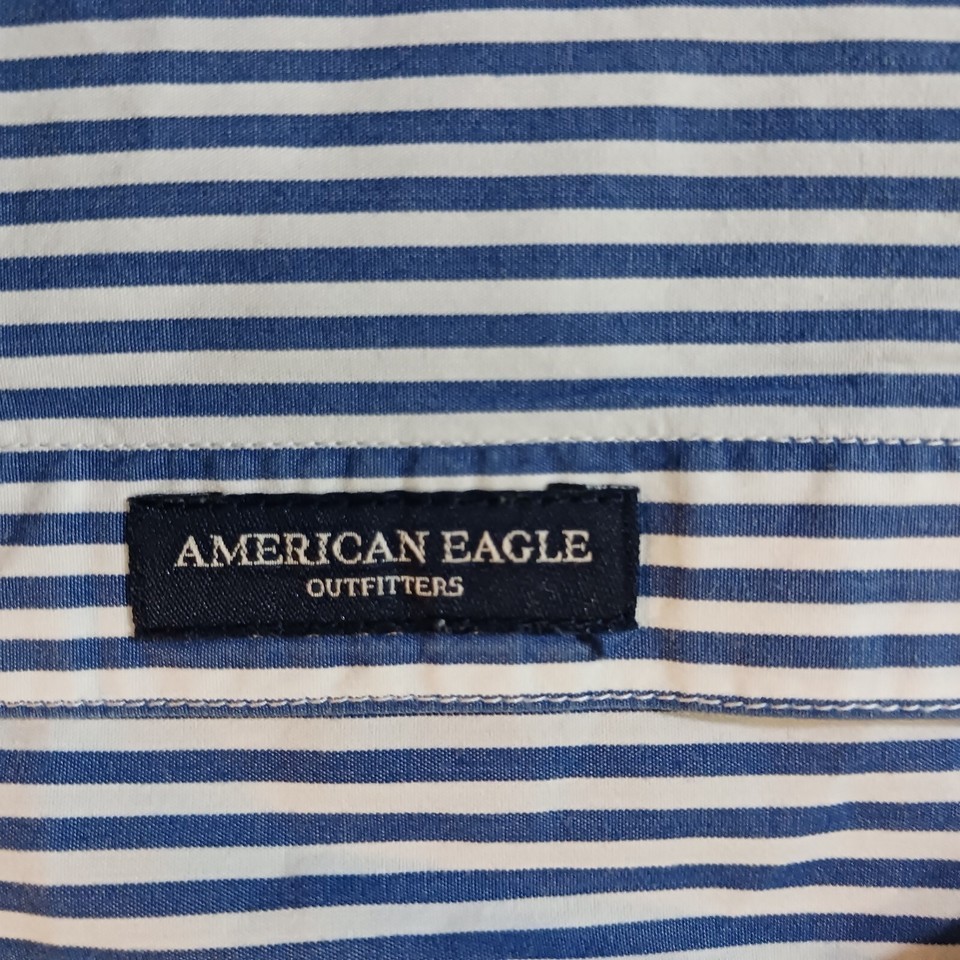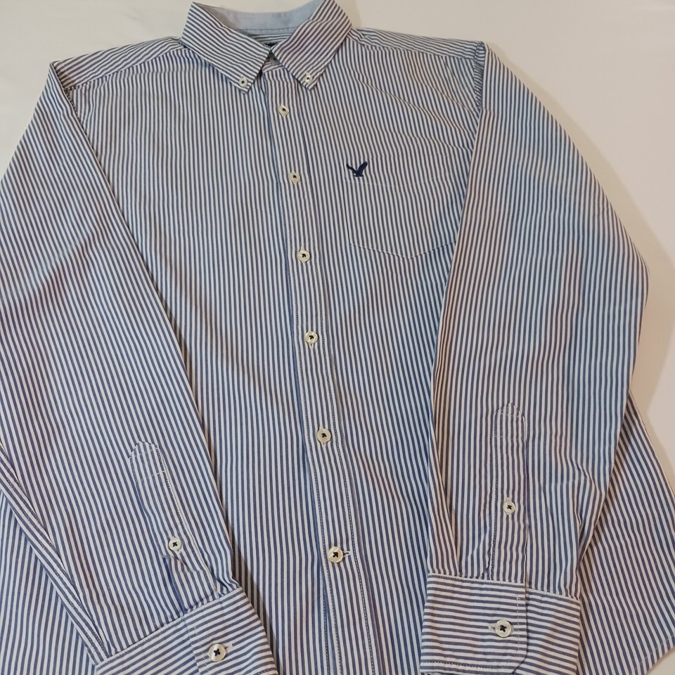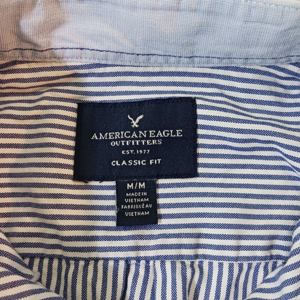This is a pre-owned American Eagle Outfitters Classic Fit shirt for men in size M. The shirt features blue and white stripes, a collared neckline, and a button closure. It has long sleeves, a button-down collar style, and a regular fit. The shirt is made of woven cotton material and is machine washable. It also has pockets and is part of the American Eagle Outfitters product line. The shirt has a Western and American theme and was made in China.