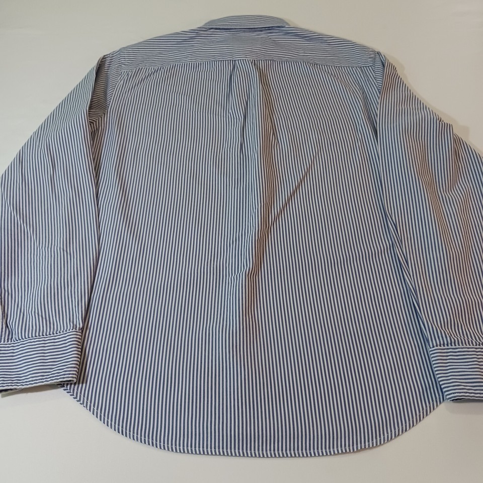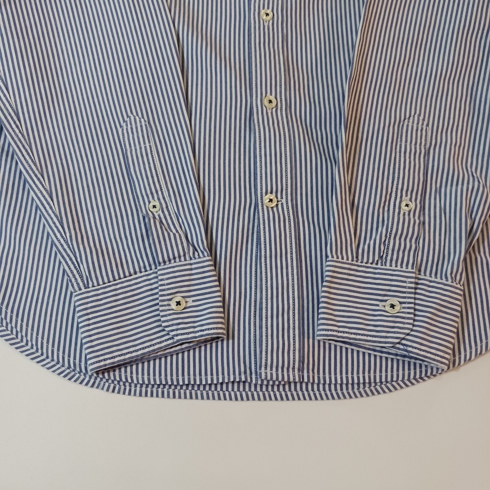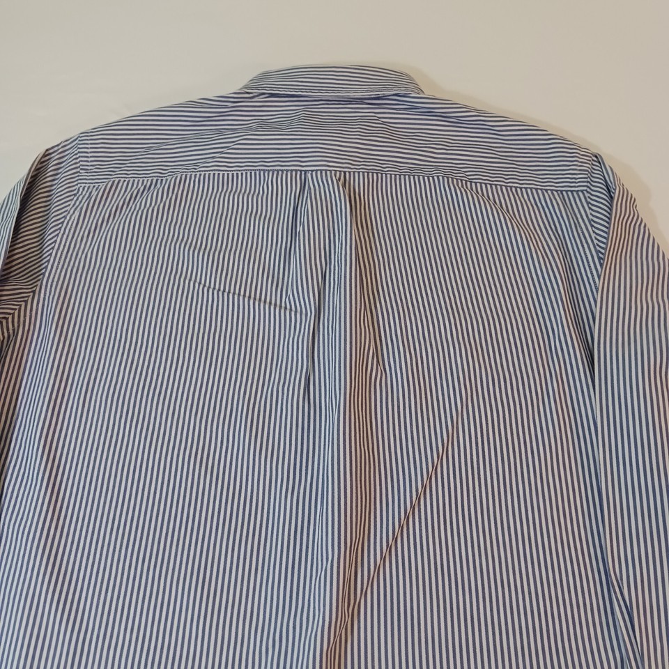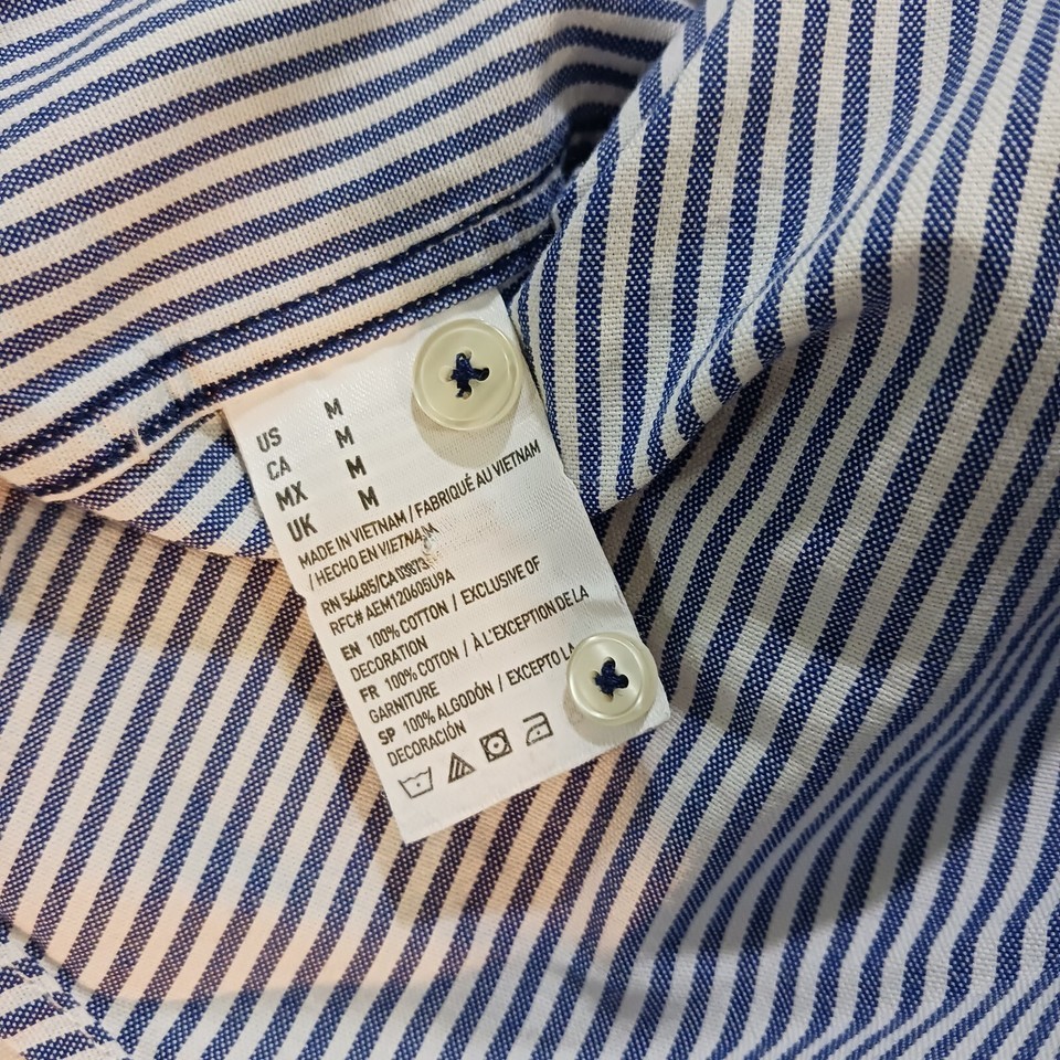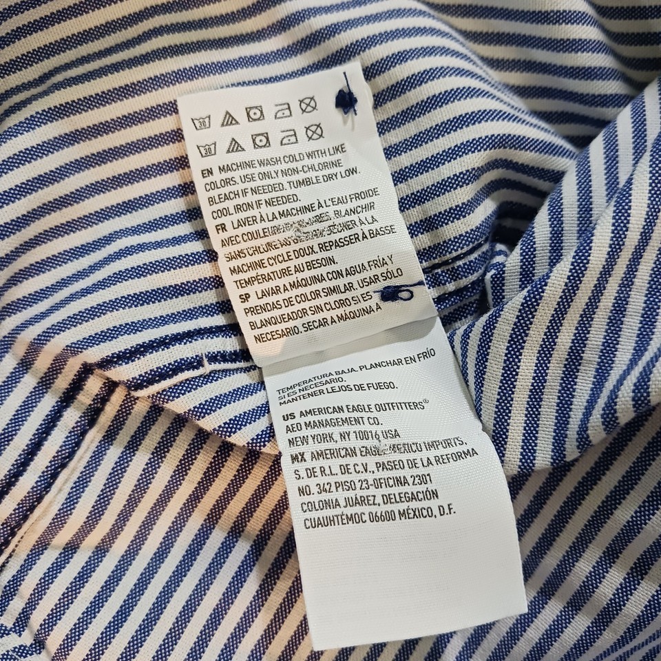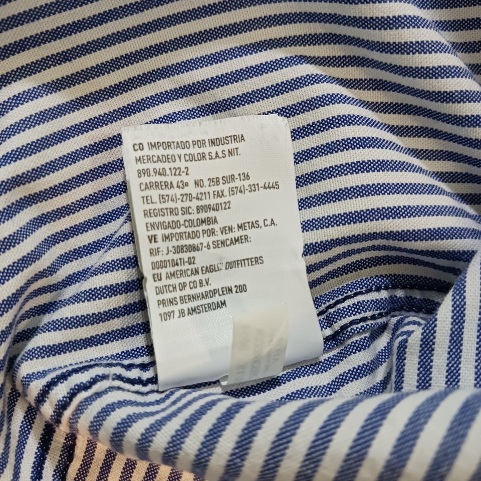 This is a pre-owned American Eagle Outfitters Classic Fit shirt for men in size M. The shirt features blue and white stripes, a collared neckline, and a button closure. It has long sleeves, a button-down collar style, and a regular fit. The shirt is made of woven cotton material and is machine washable. It also has pockets and is part of the American Eagle Outfitters product line. The shirt has a Western and American theme and was made in China.