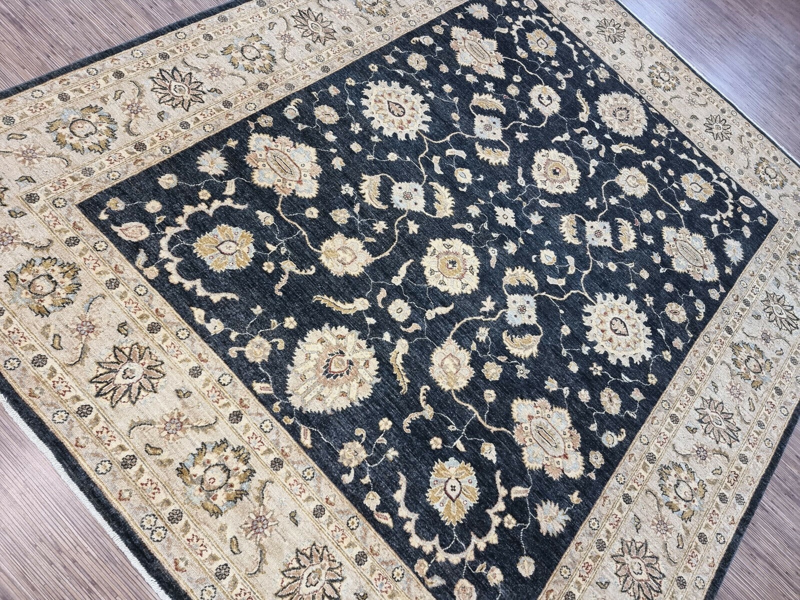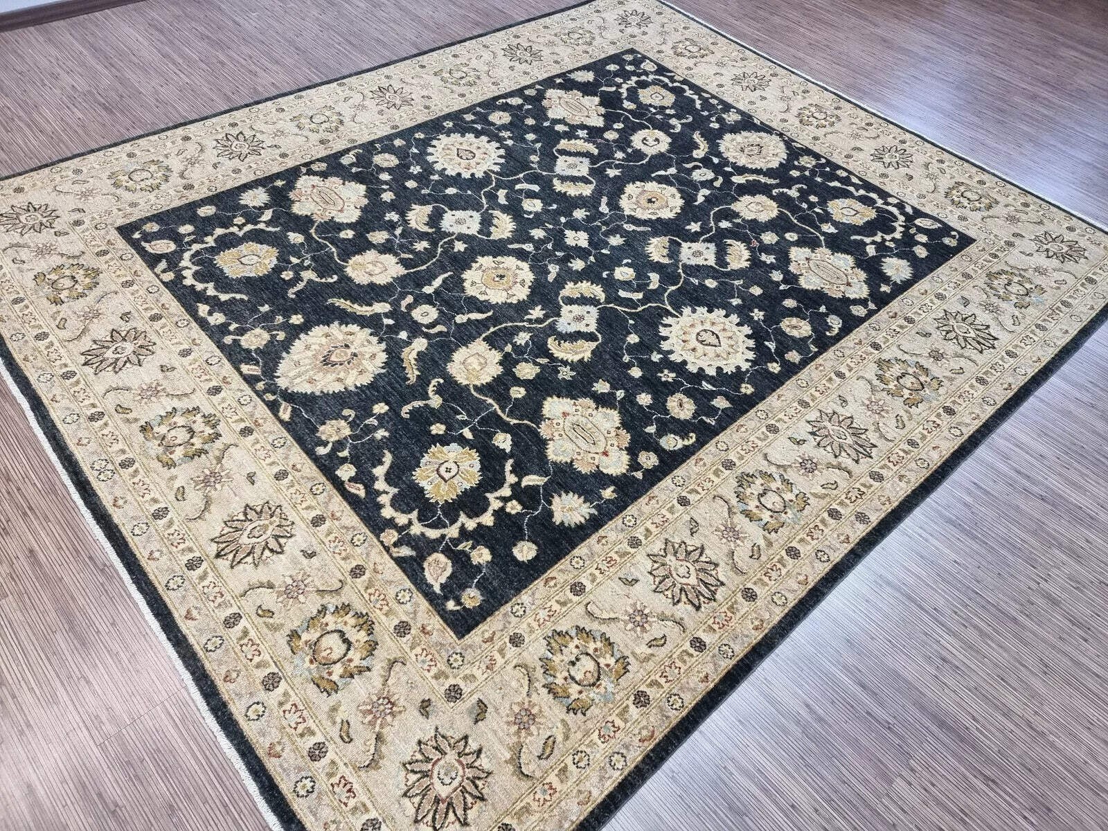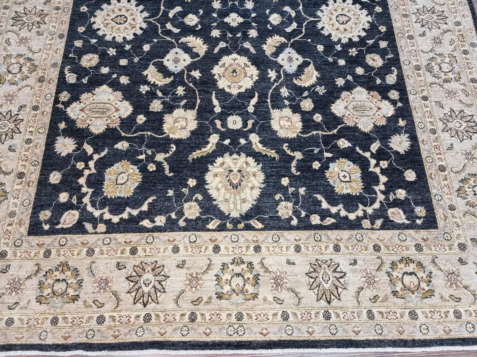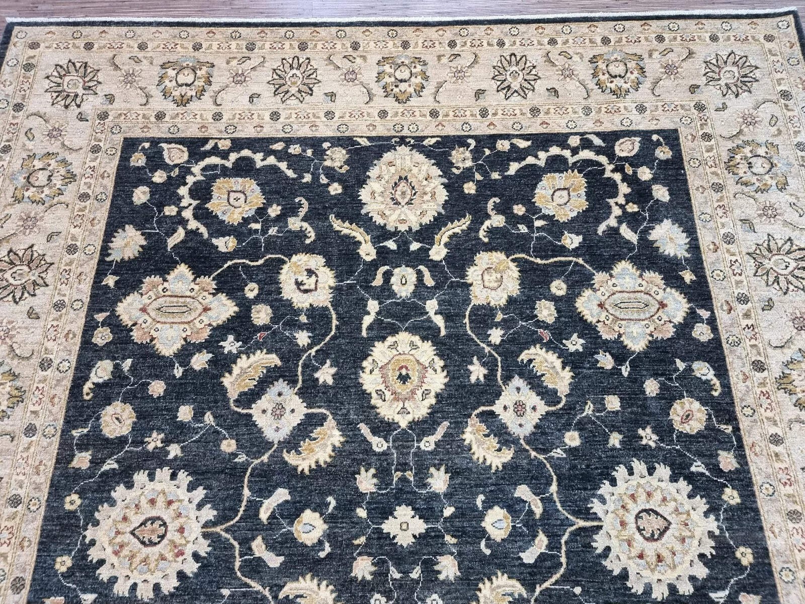 This stunning vintage Afghan Zigler rug from the 1980s is a commanding piece that exudes timeless elegance and robust quality. Hand-knotted with meticulous attention to detail, it showcases the enduring appeal of traditional Oriental design. Furthermore, its substantial size and bold, sophisticated color scheme make a powerful statement. Consequently, this rug is not just a furnishing but a foundational element that anchors and elevates any sophisticated interior. A Bold and Elegant Design The rug features the classic Zigler pattern, known for its all-over design of large, elegant floral motifs and graceful vines. This intricate pattern is rendered in a deep, striking black that creates a dramatic effect. Moreover, the design is set against a warm, neutral field that allows the bold motifs to stand out with clarity and purpose. The overall composition is both dynamic and balanced, offering visual interest from every angle. Durable and Traditional Craftsmanship Woven by skilled artisans, this rug is constructed from high-quality, durable wool on a sturdy cotton foundation. This traditional combination ensures the rug's resilience and longevity, even in high-traffic areas. The hand-knotting technique is evident in the precise, clear definition of the pattern and the rug's substantial, flat weave. This piece is guaranteed to be 100% hand-knotted, a testament to its authenticity and superior craftsmanship. A Versatile Statement Piece In excellent vintage condition for its age, this rug is ready to grace a modern home. Its generous dimensions make it an ideal centerpiece for large living rooms, dining areas, or executive offices. The elegant aesthetic, with its bold black tones, bridges modern and traditional decors with effortless grace. It adds immediate warmth, texture, and a layer of cultural depth to your space, ensuring it remains a cherished piece for years to come. Product Details Age: Circa 1980s Origin: Afghanistan Material: Hand-Spun Wool on Cotton Foundation Condition: Excellent Vintage Dimensions: In Feet: 8' 1" x 9' 7" In Centimeters: 246 cm x 296 cm In Inches: 97" x 116"