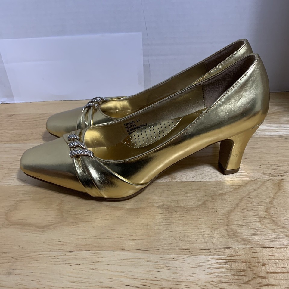 Elevate your style with these stunning Angel Steps pointed toe pumps. These shoes feature a gorgeous gold color with intricate gem detailing that adds a touch of glamour to any outfit. The faux leather upper material gives these shoes a luxurious look and feel, while the M shoe width ensures a comfortable fit.