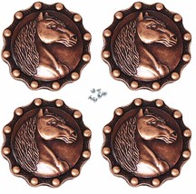 Challenger set of 4 screw back conchos measures 1-1/4" (32 mm). These antique copper finish conchos come accented with an horse head engraving. Easy to install with Chicago screws included. Use them to beautifully accents any saddle, bridle, belt, bag, jewelry, or any DIY projects.